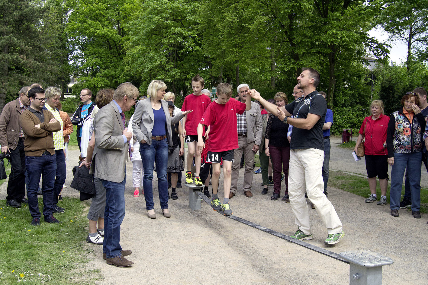 Sportwissenschaftler Oliver Seitz von der TU München stellte die Fitnessstationen vor und erläuterte das nach neuesten trainings- und sportwissenschaftlichen Erkenntnissen entstandene Bewegungskonzept.