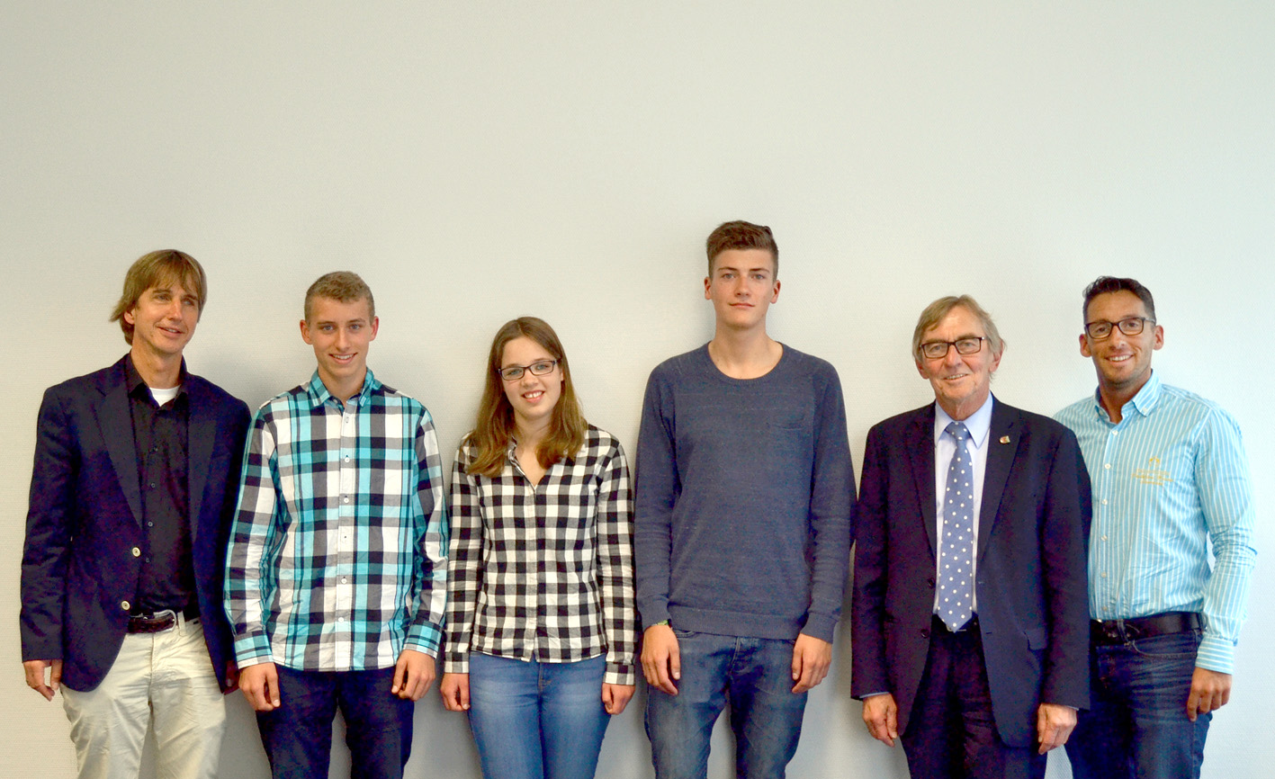 Bürgermeister Dr. Peter Paul Ahrens (2.v.r.) und die Koordinatoren des Europäischen Freiwilligendienstes Dirk Schubert (l.) und Mathias Quaschnik (r.) mit drei der vier „Europäischen Freiwilligen“: Philip Scharmentke, Laura Führer und Julian Bals.