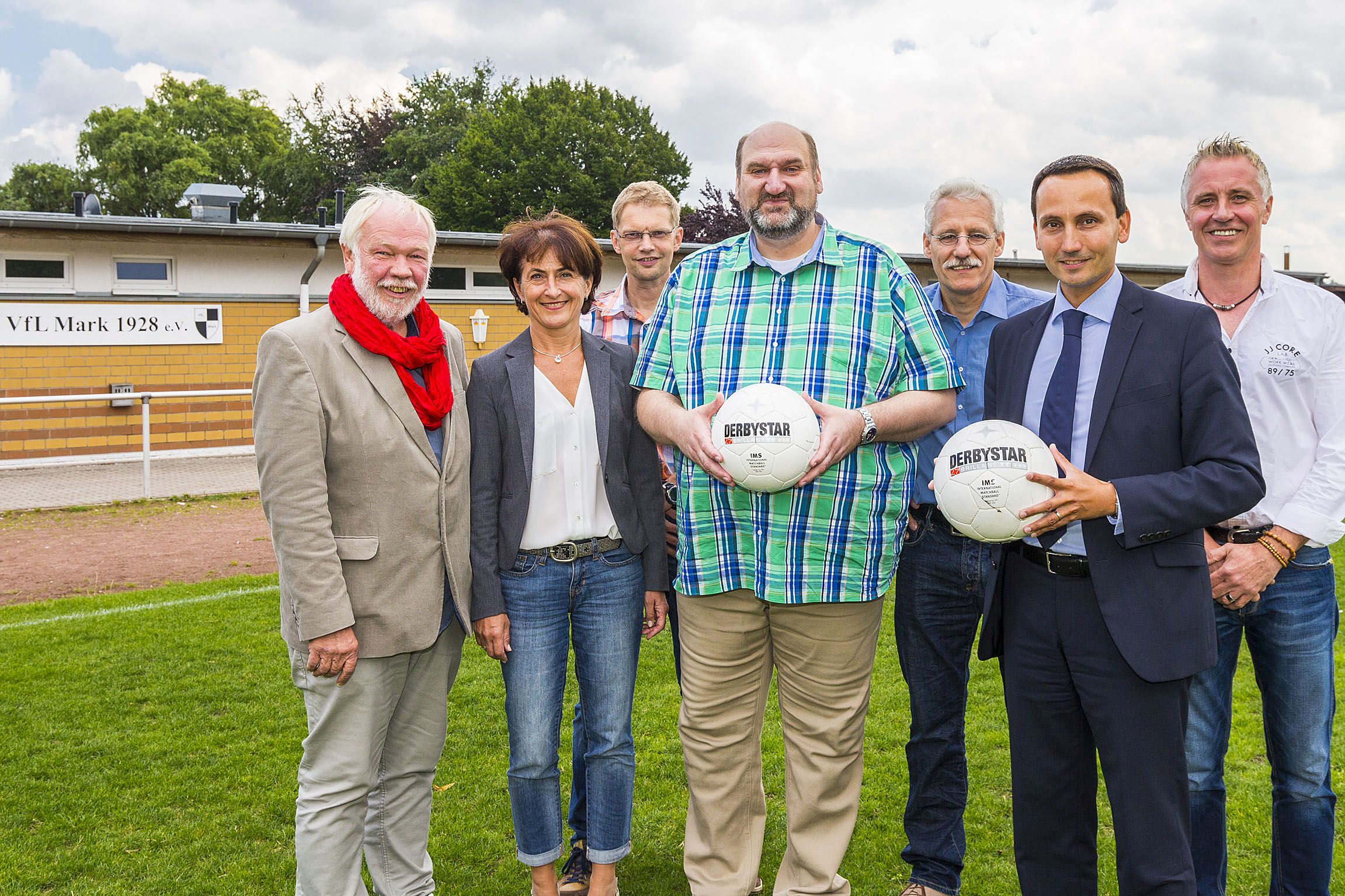 v.l.n.r.: SPD-Ratsherr Ralf-Dieter-Lenz, Karin Diebäcker (stellvertretende Schul- und Sportamtsleiterin), Peter Klatt (Abteilungsleiter Sportvereins- und Schulsportförderung), Jörg Wedekind (1. Vorsitzender VfL Mark), Gregor Kotzott (Hauptkassierer VfL Mark), Stadtkämmerer und Schul- und Sportdezernent Markus Kreuz sowie Burkhard Linde (2. Vorsitzender VfL Mark)