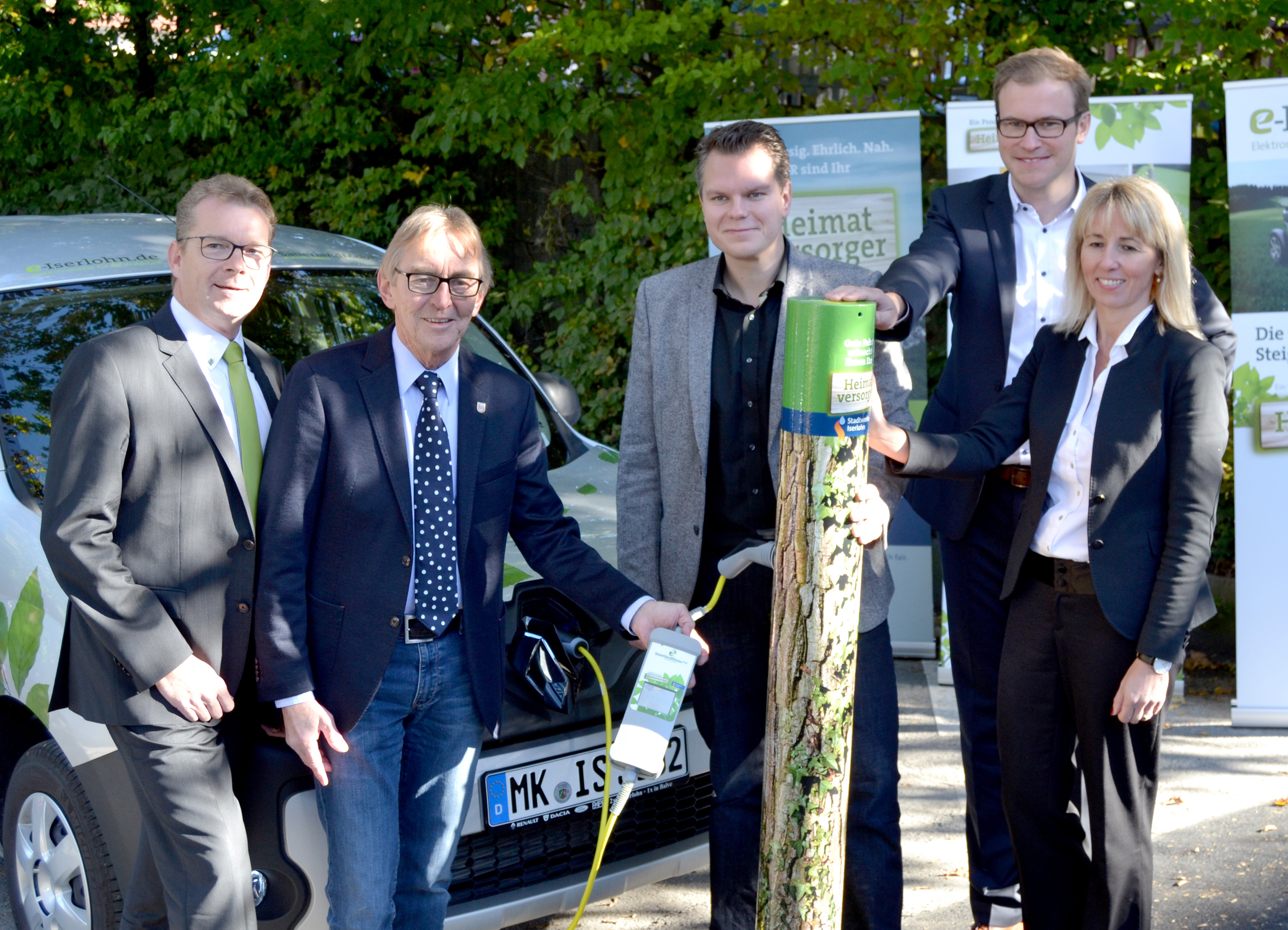 Stellten bei einem Pressegespräch das Pilotprojekt von Stadt Iserlohn, Stadtwerke und dem Berliner Start-Up Unternehmen ubitricity für Elektromobilität vor (v.l.): Reiner Timmreck, Stadtwerke-Geschäftsführer, Bürgermeister Dr. Peter Paul Ahrens, der städtische Ressortleiter Mike Janke, ubitricity-Projektmanager Dr. Niklas Schirmer und die städtische Klimaschutzbeauftragte Ulrike Badziura.