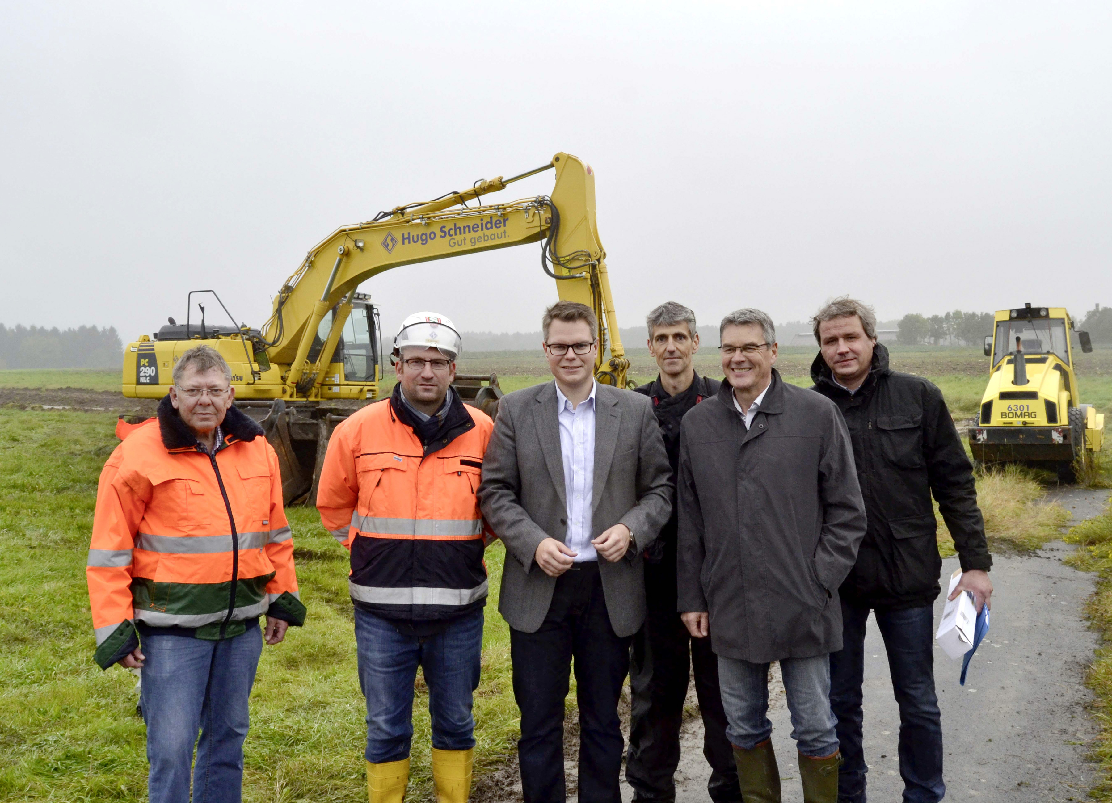 Bei einem Pressegespräch auf der Baustelle erläuterten Ressortleiter Mike Janke (M.) und die zuständigen Mitarbeiter aus dem Bauressort gemeinsam mit Vertretern der Baufirma Hugo Schneider die Erschließungsarbeiten für die Erweiterung des Gewerbegebietes Sümmern-Rombrock.