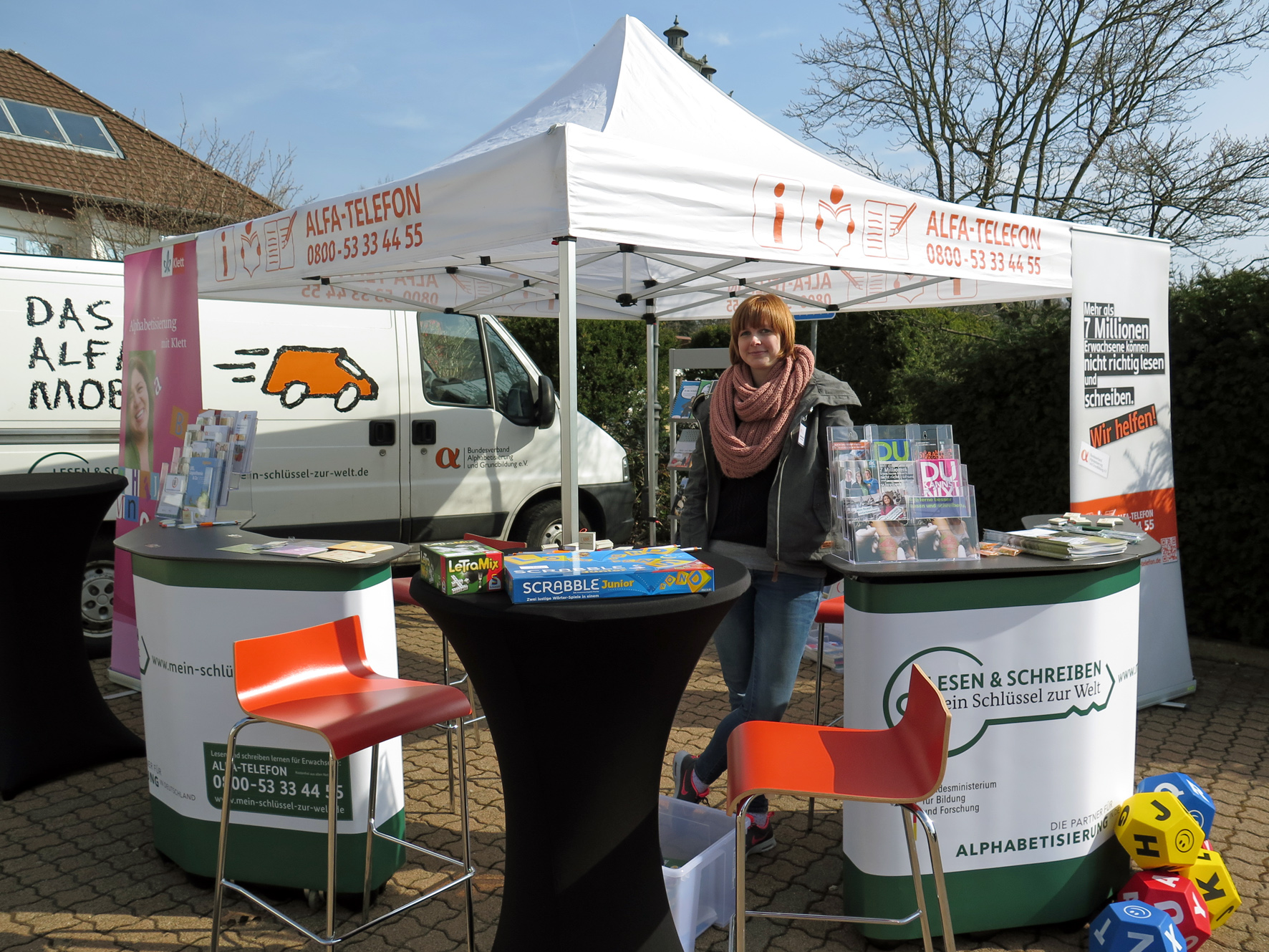 Am Alfa-Mobil informieren die Mitarbeiterinnen und Mitarbeiter des BVAG im Rahmen der Kampagne „Mein Schlüssel zur Welt“ bundesweit zum Thema Analphabetismus in Deutschland. (Foto: Bundesverband Alphabetisierung und Grundbildung e. V.)