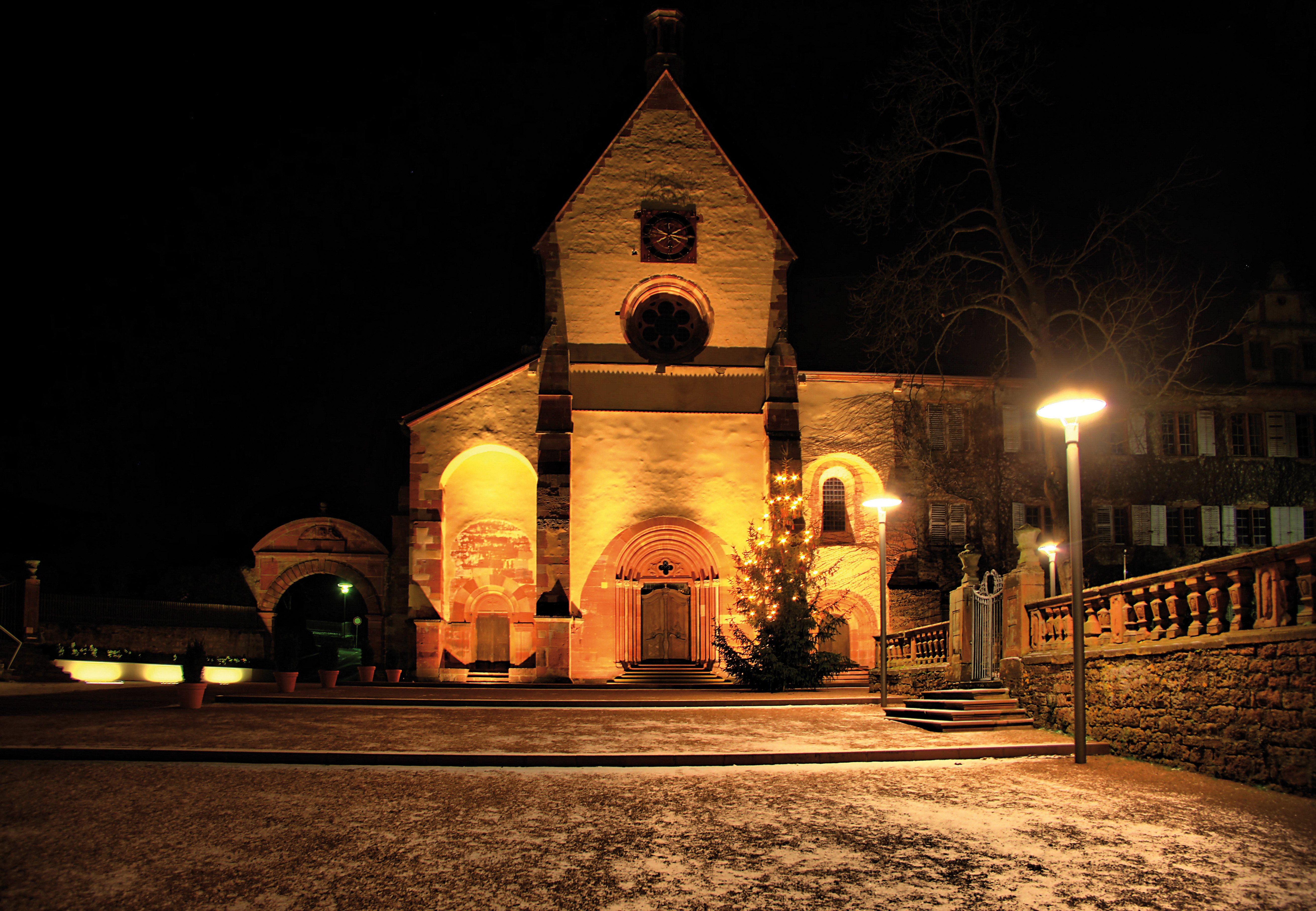 Das Kloster Bronnbach verwandelt sich am zweiten Adventswochenende wieder in einen stilvollen Weihnachtsmarkt. Vor der Hauptfassade werden Glühwein, Punsch sowie kleine Speisen und Delikatessen angeboten. Foto: Landratsamt Main-Tauber-Kreis
