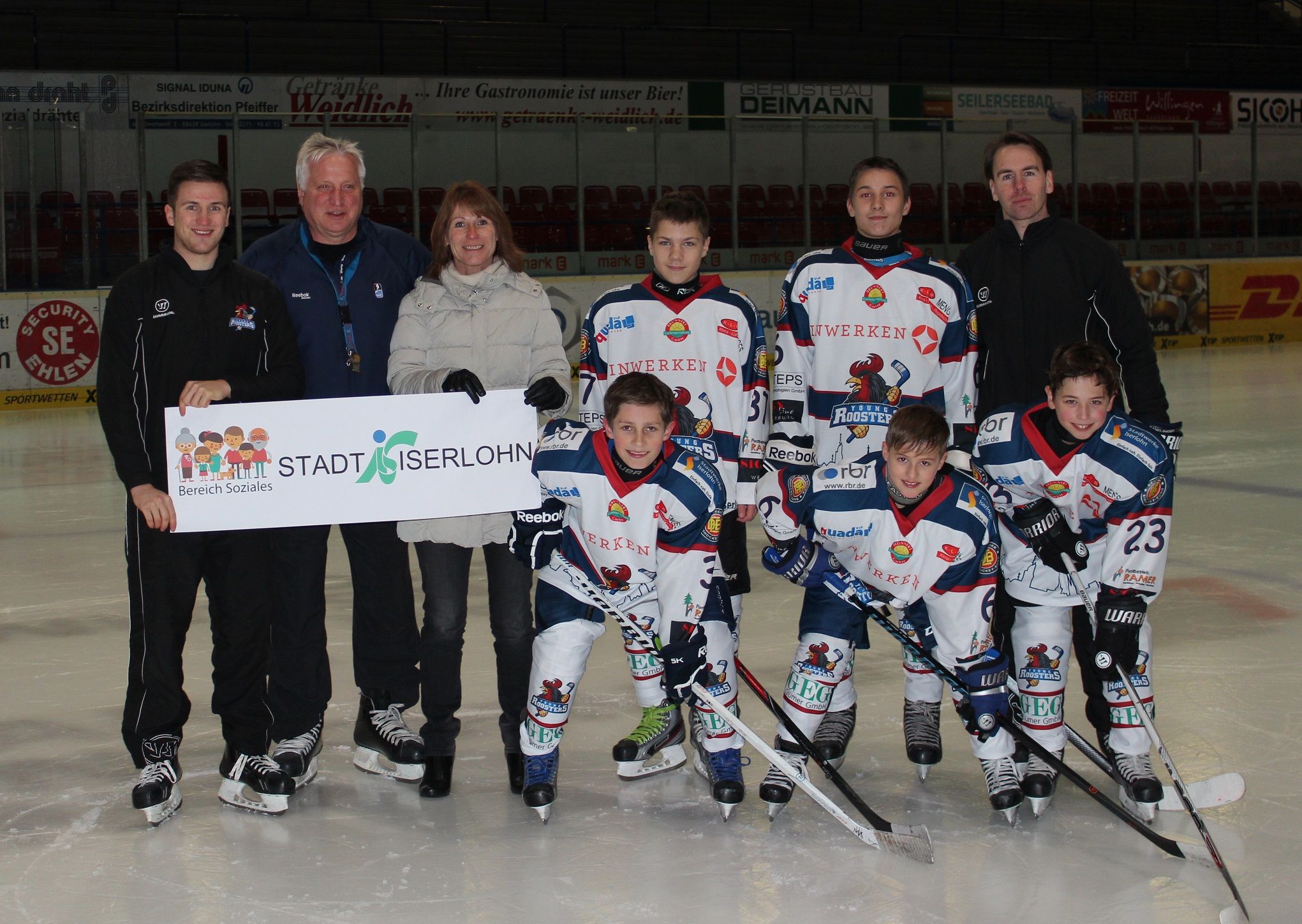 v.l.n.r.: Tim Schneider, Dieter Brüggemann, Sabine Loosen, fünf hoffnungsvolle Talente der Young Roosters sowie Colin Danielsmeier laden zur Besichtigungs-Tour ein.