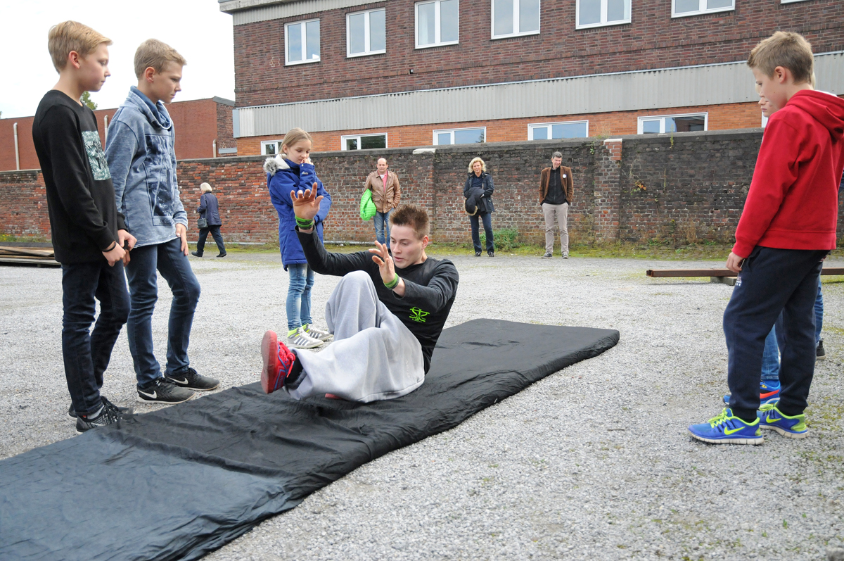Parkourtrainer Pascal Lipinski zeigt, wie man sich richtig abrollt - Foto: vom "Culture voll fett festival" am 3. Oktober 2015 - Foto: Bruno Wansing, bocholt.de