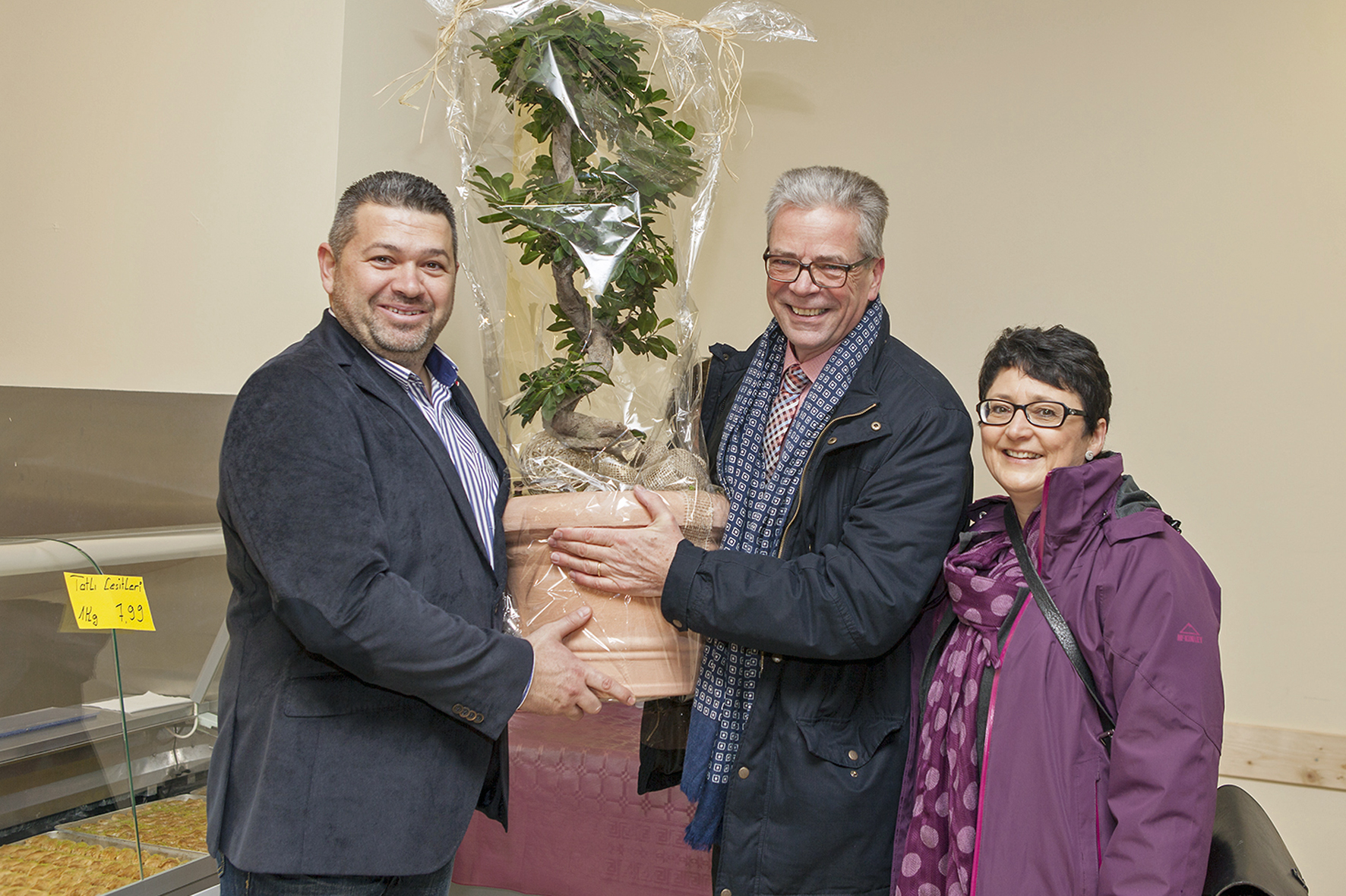 Peter Brautmeier und Frauke Wiering überbringen Inhaber Cenk Ulu die besten Wünsche der Stadt Herten zur Eröffnung seines neuen Supermarktes.