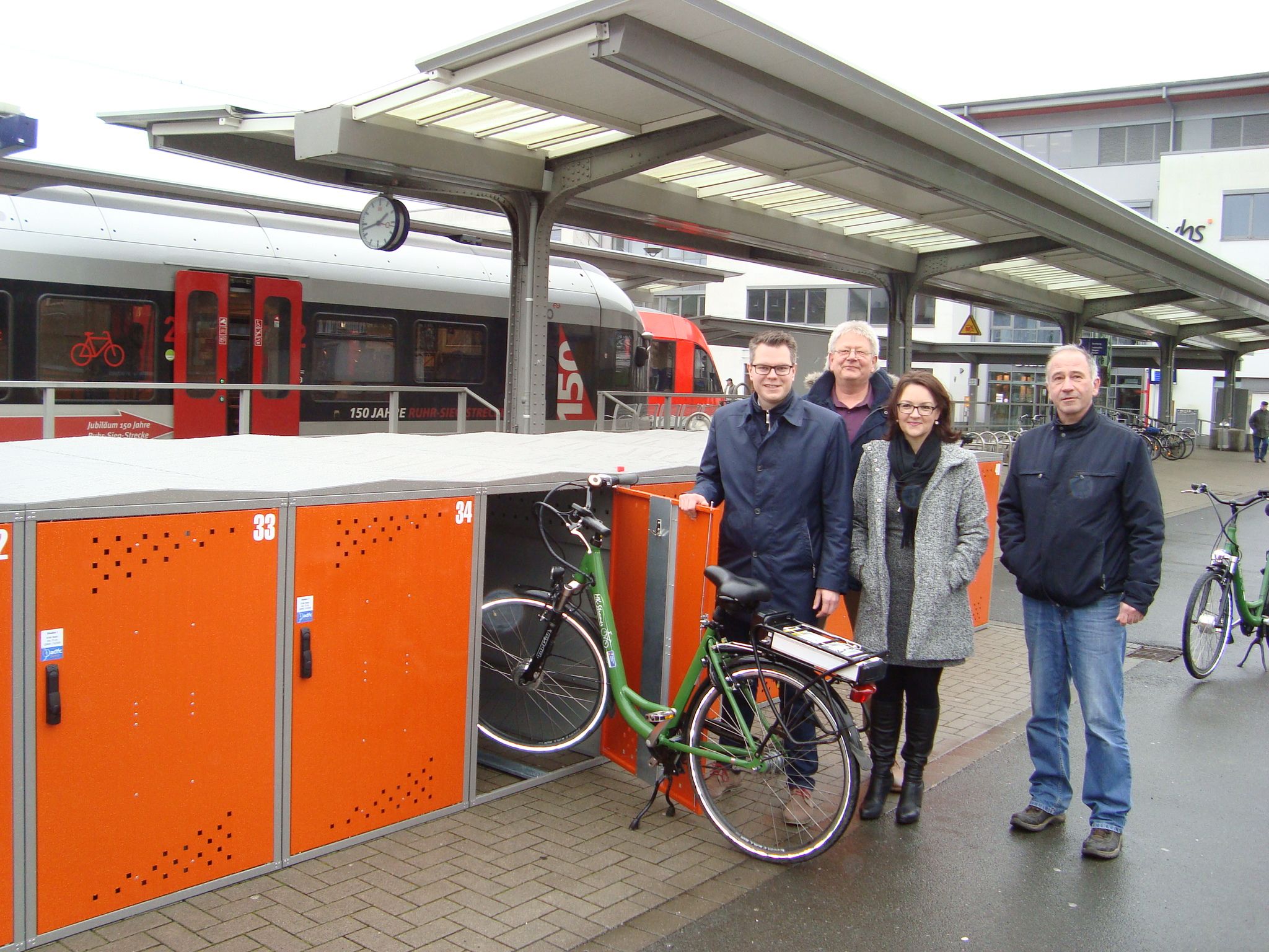 Stellten bei einem Pressetermin die neuen Fahrradboxen am Stadtbahnhof vor (v.l.): Ressortleiter Mike Janke, Bernd Schlünder und Michael Kuprat von der Abteilung Verkehrsplanung sowie Tanja Götz von der Stadtinformation.