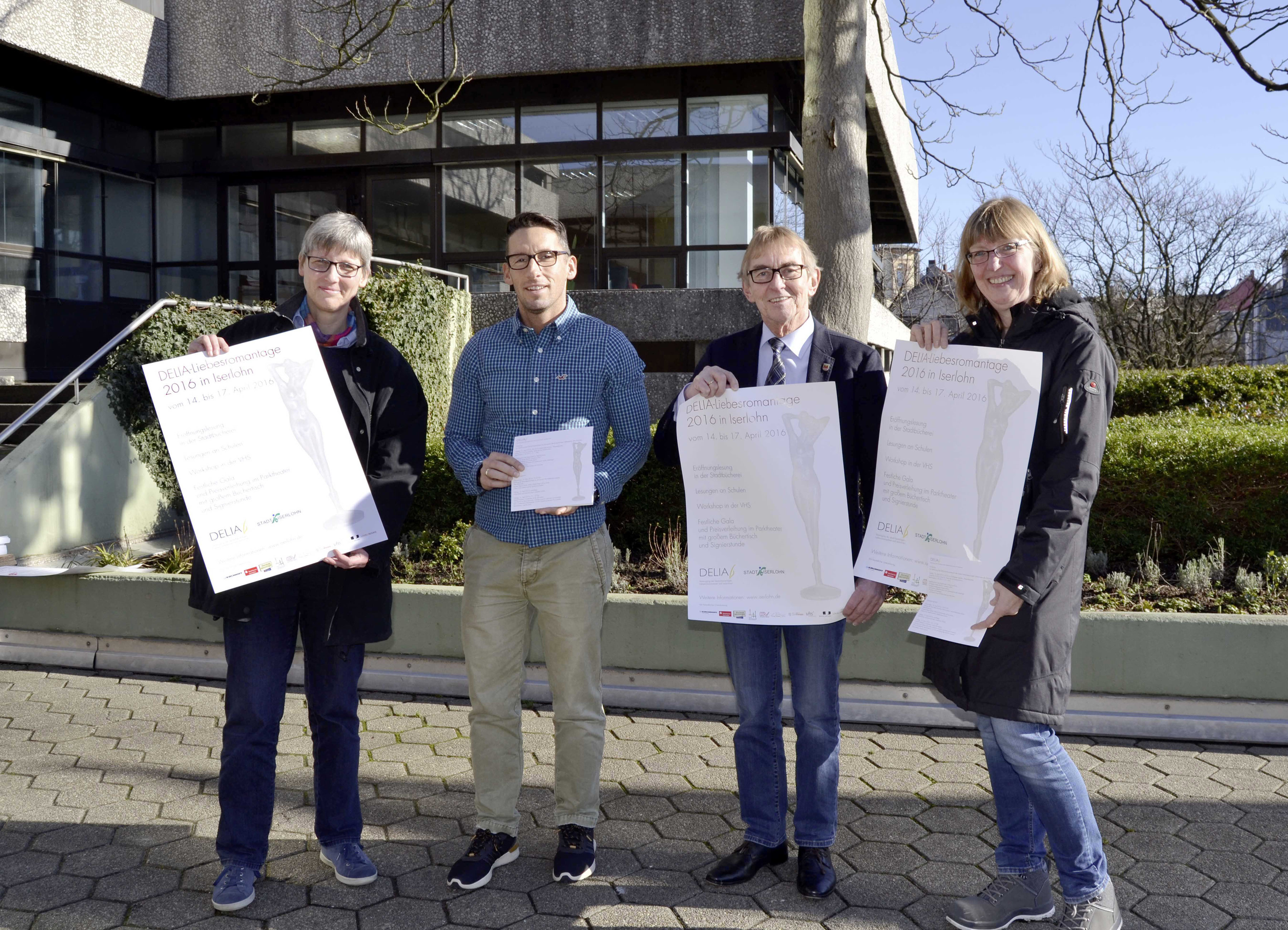 DELIA-Präsidentin Andrea Reichart, Bürgermeister Dr. Peter Paul Ahrens, Kulturressortbüroleiter Matthias Quaschnik und Büchereileiterin Gudrun Völcker (v.r.) stellten das Programm der DELIA-Liebesromantage 2016 in Iserlohn vor.