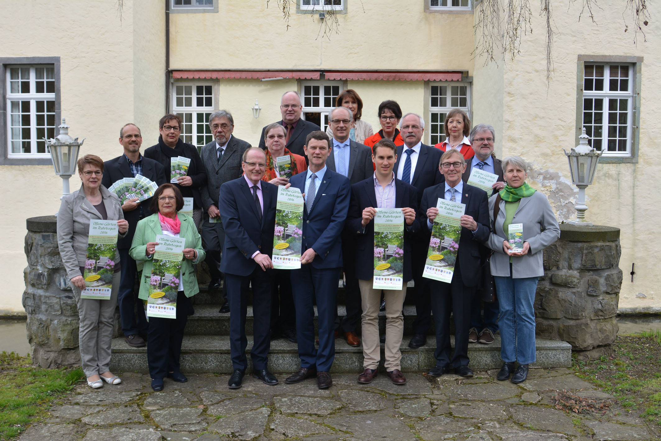 Bürgermeister der beteiligten Städte sowie Mitglieder der Projektgruppe stellten am Mittwoch, 13. April, im Schloss Wocklum in Balve die Broschüre „Offene Gärten im Ruhrbogen 2016“ vor.