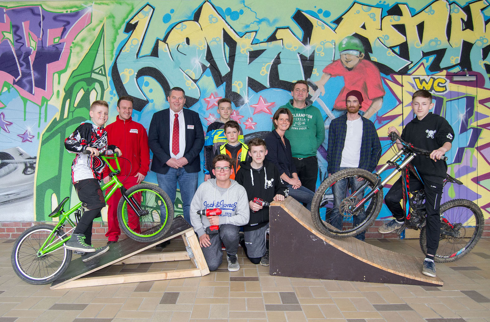 Für die Materialspende zum Bau der neuen Rampe bedankten sich Ronny Badtke, Abteilungsleiterin Jugendarbeit der Stadt Iserlohn, Projektbetreuer Arnd Winkhaus und Streetworker Rene Zeiler gemeinsam mit den Jugendlichen bei Hellweg-Filialleiter Jörg Schwarz und Abteilungsleiter Olaf Birkenau.
