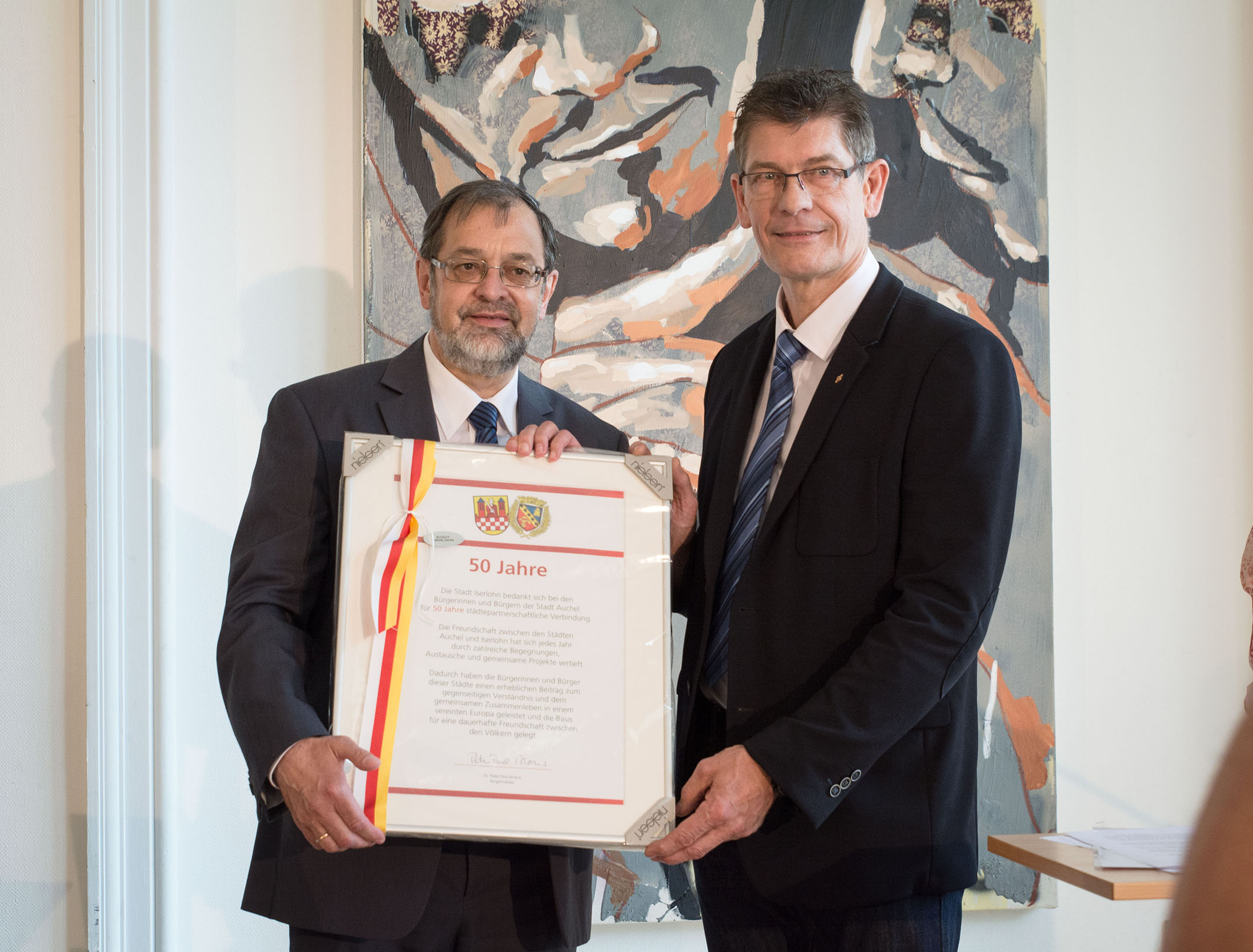 Der stellvertretende Bürgermeister Michael Scheffler überreichte Michel Vivien von der Stadt Auchel die Jubiläumsurkunde mit dem Dank an die Aucheler Bürgerinnen und Bürger.