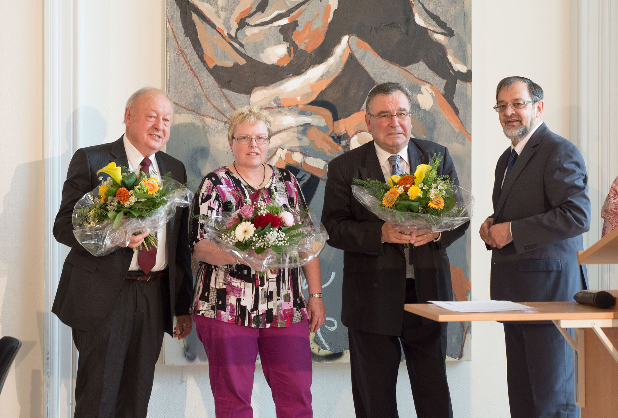Dank gebührte auch den ehrenamtlichen Komiteevorsitzenden Susanne Zebandt aus Letmathe und den Herren Opigez und Lambert (v.l.) aus Auchel.