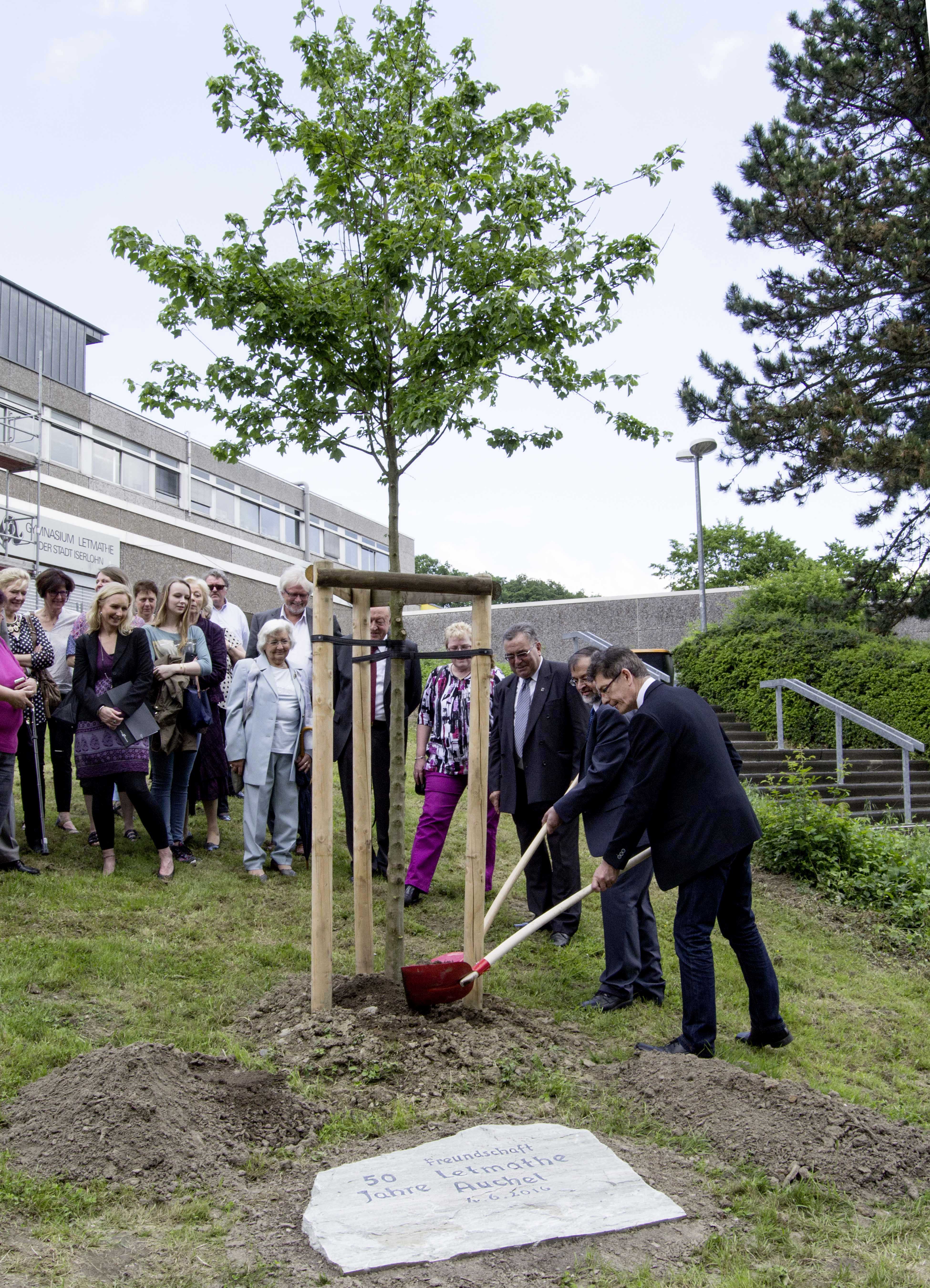 Michael Scheffler und Michel Vivien bei der symbolischen Pflanzung des französischen Ahorns.