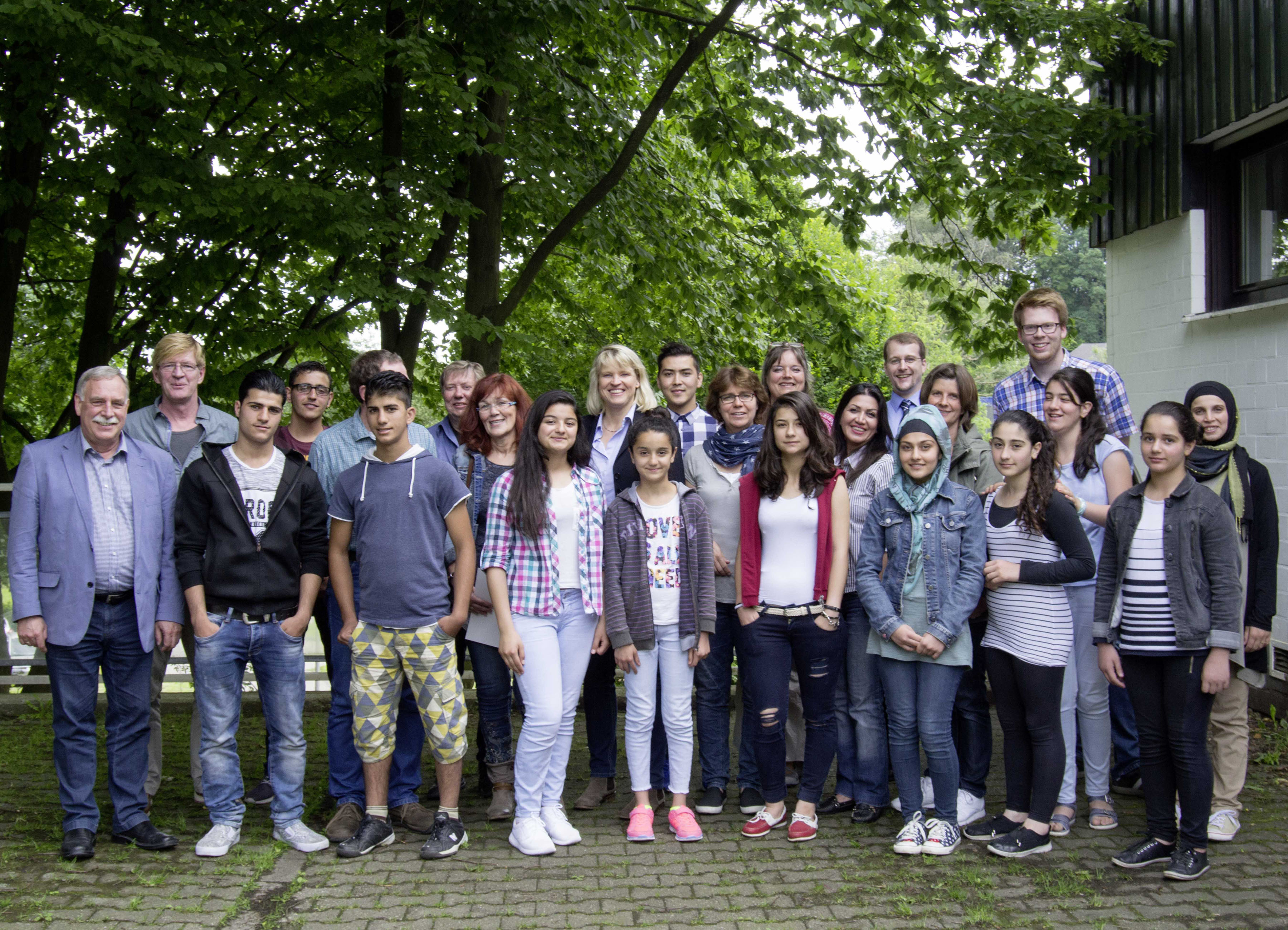 Die Projektbeteiligten von Stadt Iserlohn und Realschule am Hemberg stellten gemeinsam mit den Kooperationspartnern und Schülerinnen und Schülern der internationalen Klasse das Sprachförderprojekt bei einem Pressetermin vor.