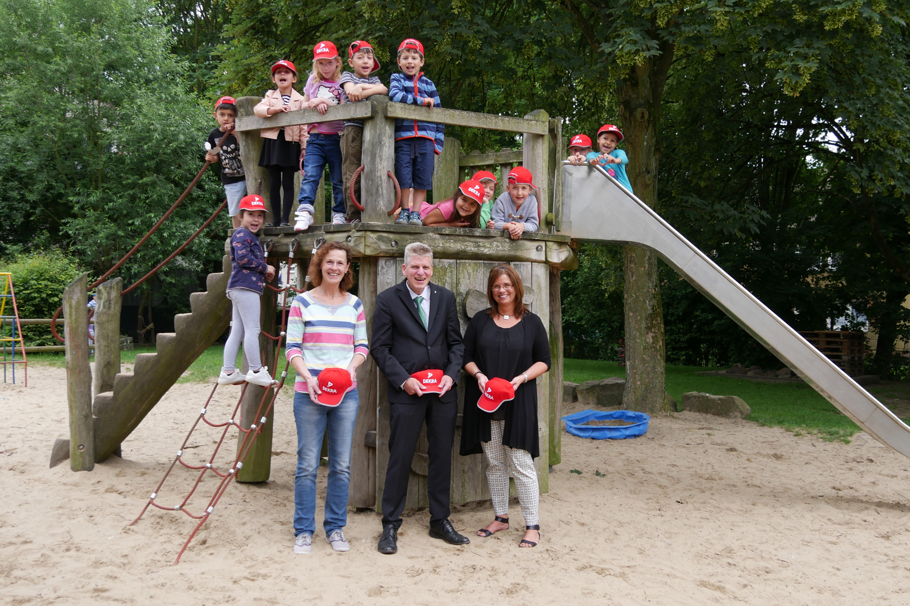 Kindergartenleiterin Birgit Scholz, Carsten Debler, Niederlassungsleiter der Dekra Niederlassung Essen und die zweite stellvertretende Bürgermeisterin Silvia Godde verteilten die Kinderkappen an die ‚Schulkinder‘ vom Kindergarten Pusteblume.