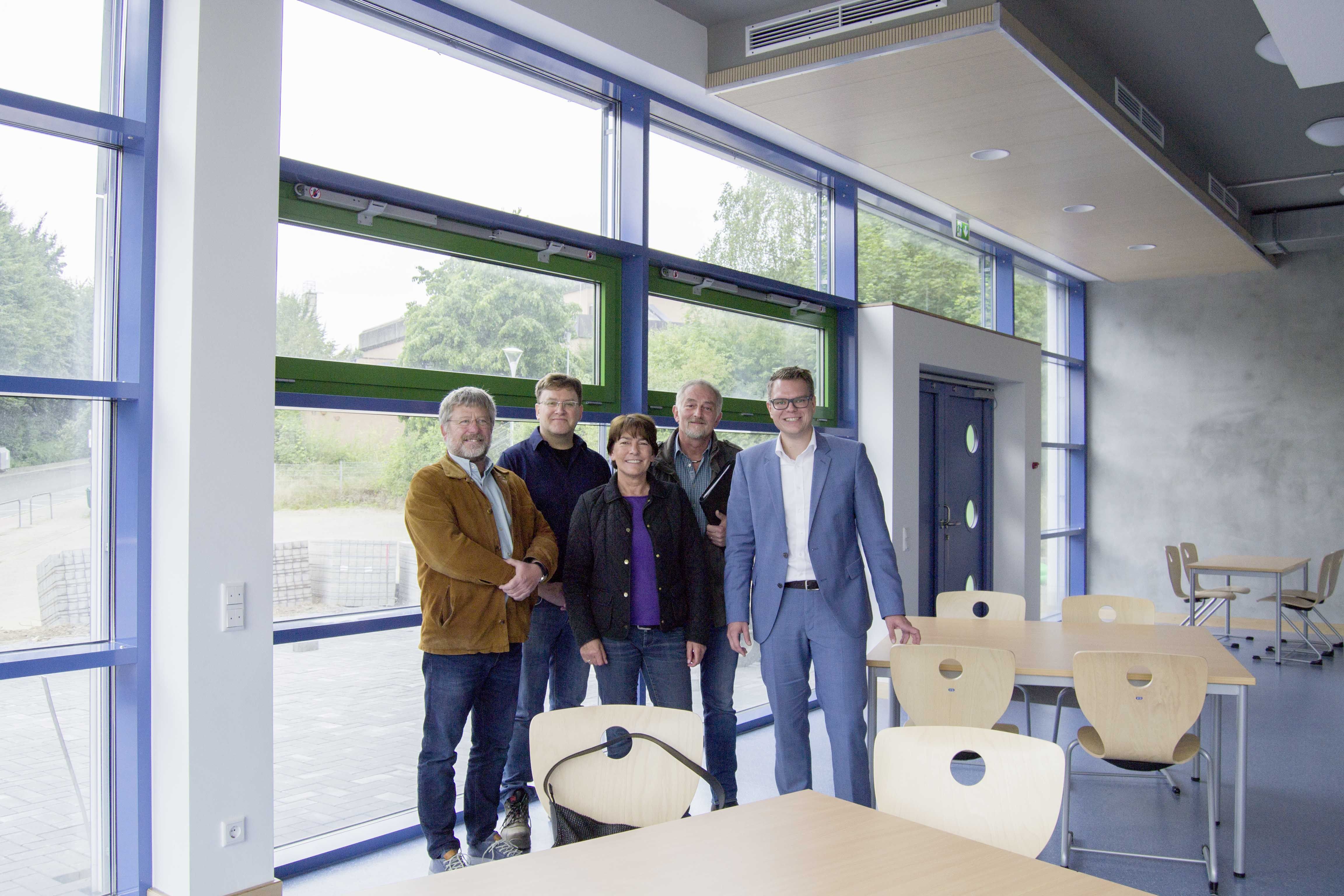 Stellten den neuen Anbau vor: Martin Bürger-Neumann (Techn. Leiter Kommunales Immobilien Management), Andreas Schultze (Bauleiter Kommunales Immobilien Management), Medienreferentin Christine Schulte-Hofmann, Architekt Frank Göcking und Stadtbaurat Mike-Sebastian Janke.