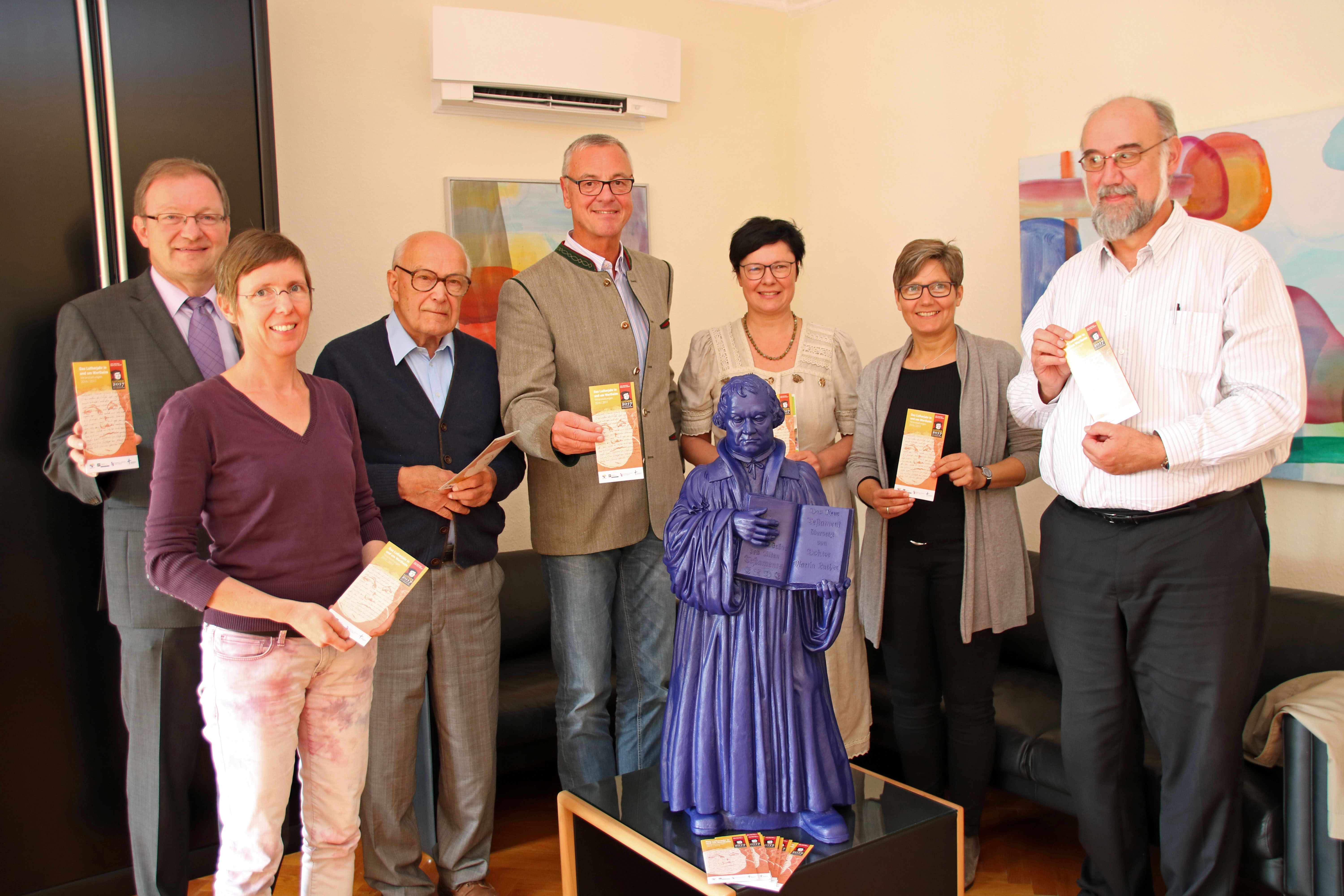 Vorstellung des Programms „Das Lutherjahr in und um Wertheim“ im Rathaus (von links): Bezirkskantorin Katharina Wulzinger, Dekan Hayo Büsing, Erich Langguth (Historischer Verein), Oberbürgermeister Stefan Mikulicz, Ute Eberling, Pfarrerin Gudrun Mirlein und Pfarrer Klaus Betschinske. Foto: Stadt Wertheim