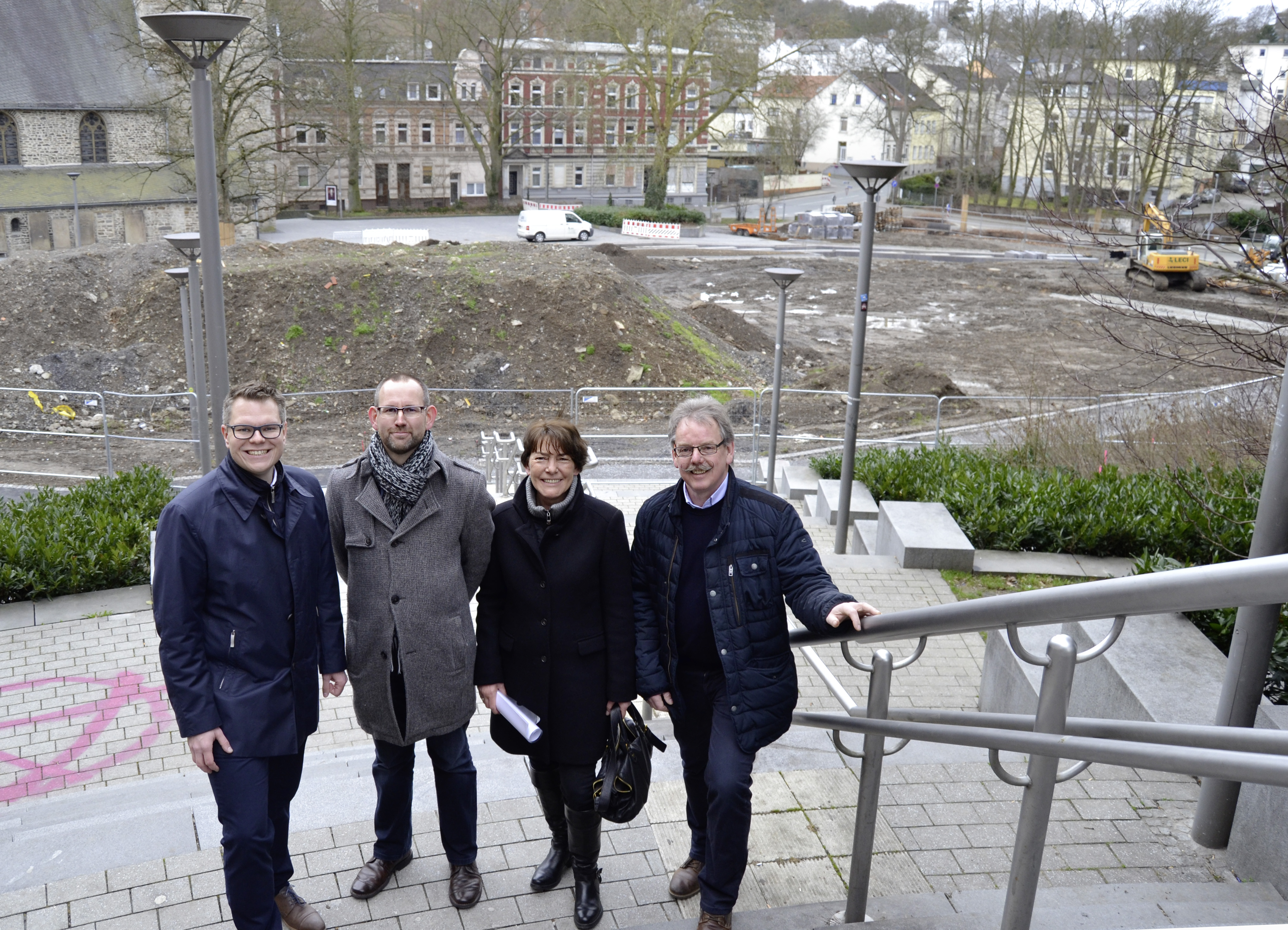 Erläuterten den Stand der Arbeiten bei der Umgestaltung des Fritz-Kühn-Platzes. Von links: Stadtbaurat Mike-Sebastian Janke, Stadtplaner Thorsten Grote, Medienreferentin Christine Schulte-Hofmann und Grünflächenplaner Ingo Genster.