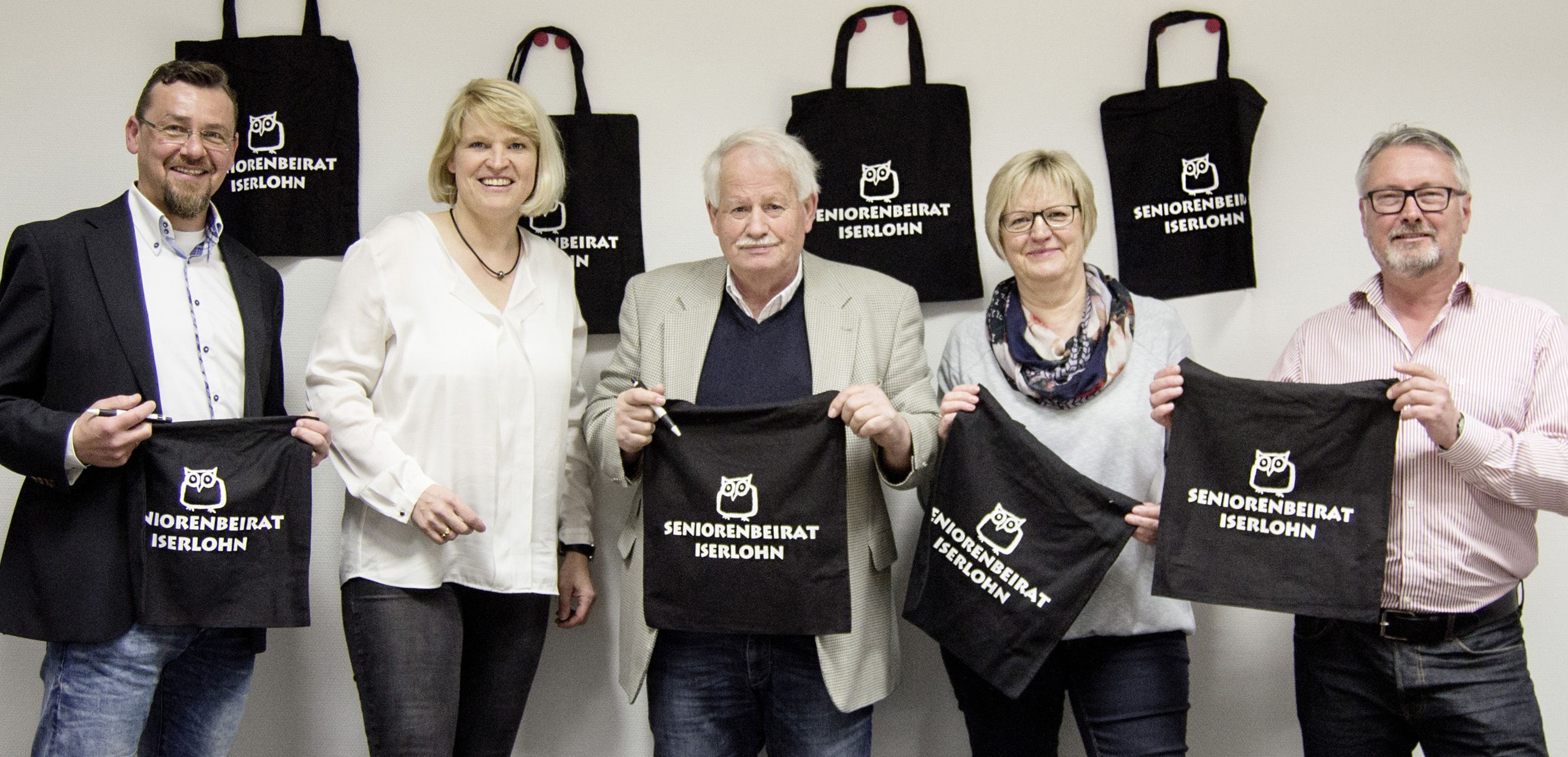 Stellten bei einem Pressetermin die neuen Werbematerialien vor: (v. l. n. r.) Thorsten Klein (Abteilung für Senioren und Menschen mit Behinderung), Erste Beigeordnete Katrin Brenner, Joachim Pfänder und Uta Lichtenheldt-Leisgen (beide Seniorenbeirat) sowie Stephan Schefers (Abteilung für Senioren und Menschen mit Behinderung).