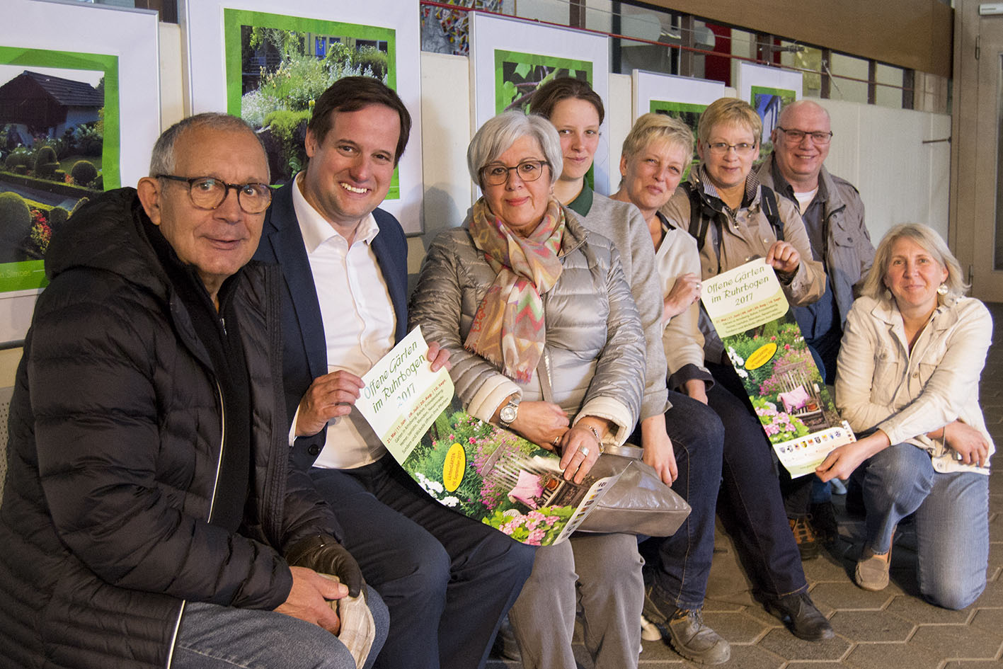 Der stellvertretende Bürgermeister Thorsten Schick (2.v.l.) eröffnete im Beisein zahlreicher Gartenbesitzer und Patricia White von der Abteilung Umwelt und Klimaschutz der Stadt Iserlohn (r.) die Ausstellung zur Veranstaltungsreihe „Offene Gärten im Ruhrbogen“.