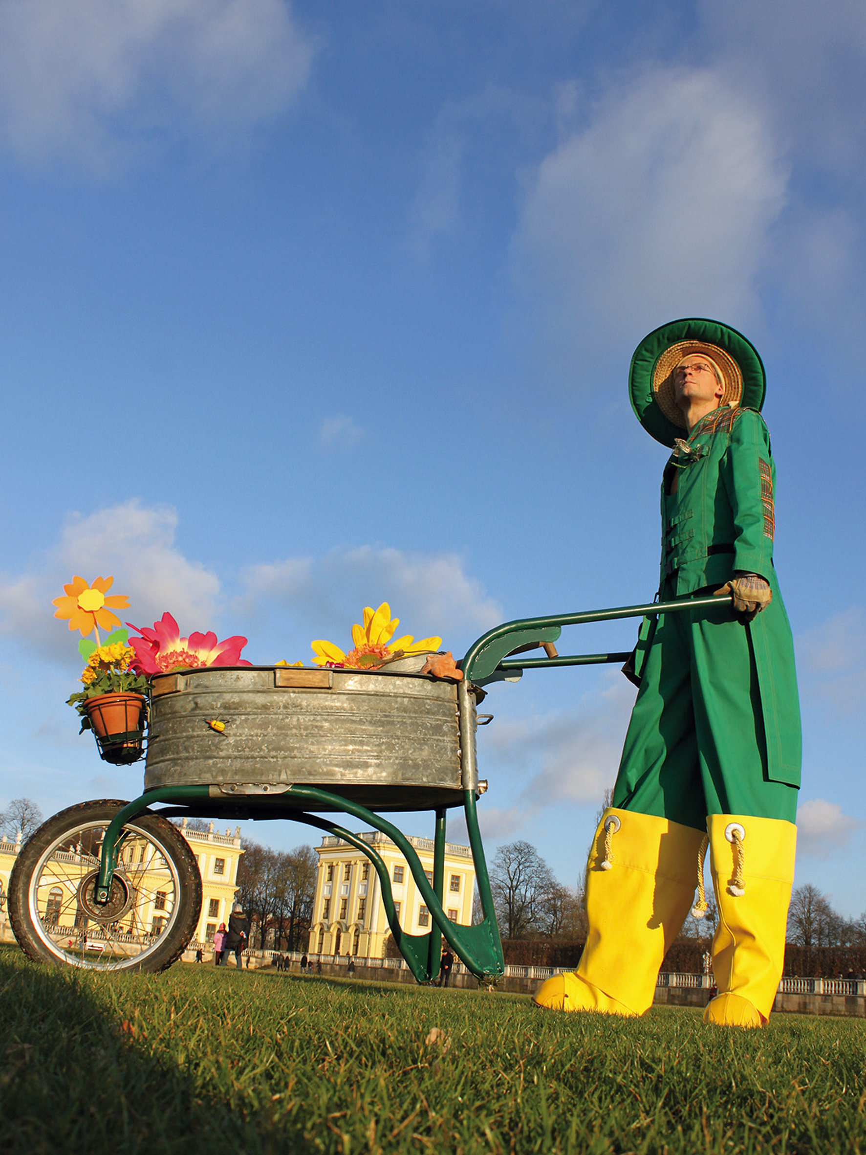 Imanuel Immergrün, 240 cm groß, farbenprächtig und des Lebens froh behält auf dem Blumen- und Gartenmarkt den Überblick.