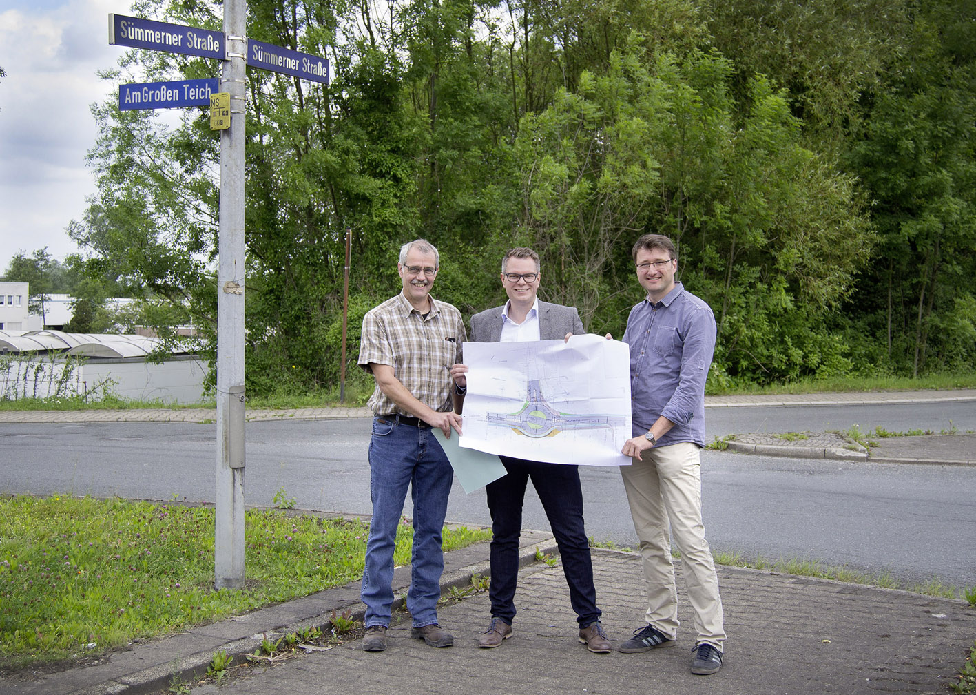 Stadtbaurat Mike-Sebastian Janke (M.), Abteilungsleiter Stefan Thiemann (r.) und Bauleiter Alexander Sprung erläuterten bei einem Pressetermin den Ablauf der Baumaßnahme „Kreisverkehr Sümmern“.