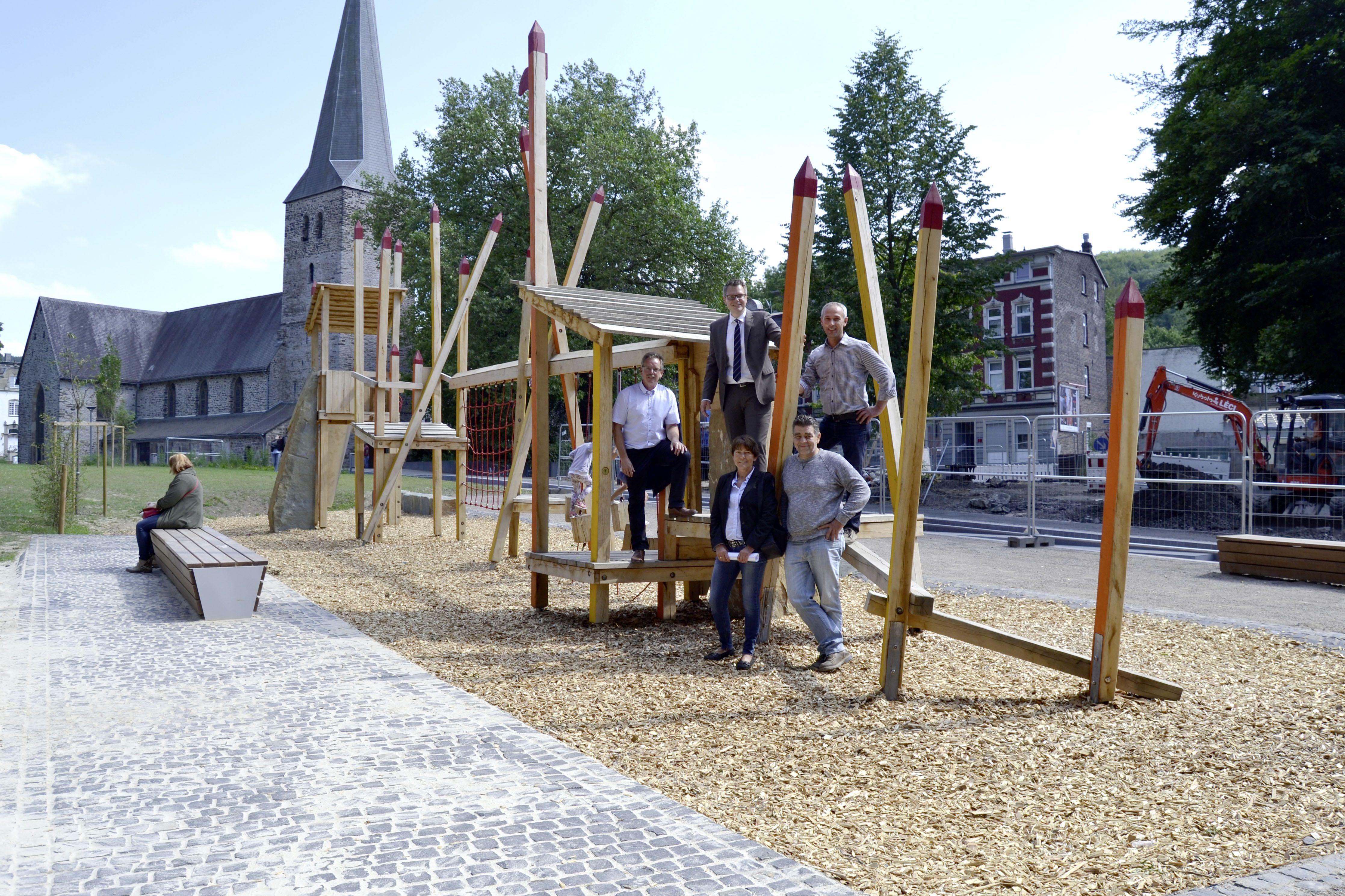 Grünflächenplaner Ingo Genster, Stadtbaurat Mike-Sebastian Janke, Medienreferentin Christine Schulte-Hofmann und die Vertreter der Baufirma Leci (von links) erläuterten nach der offiziellen Freigabe des Spielplatzes die noch anstehenden Arbeiten zur Umgestaltung des Fritz-Kühn-Platzes.