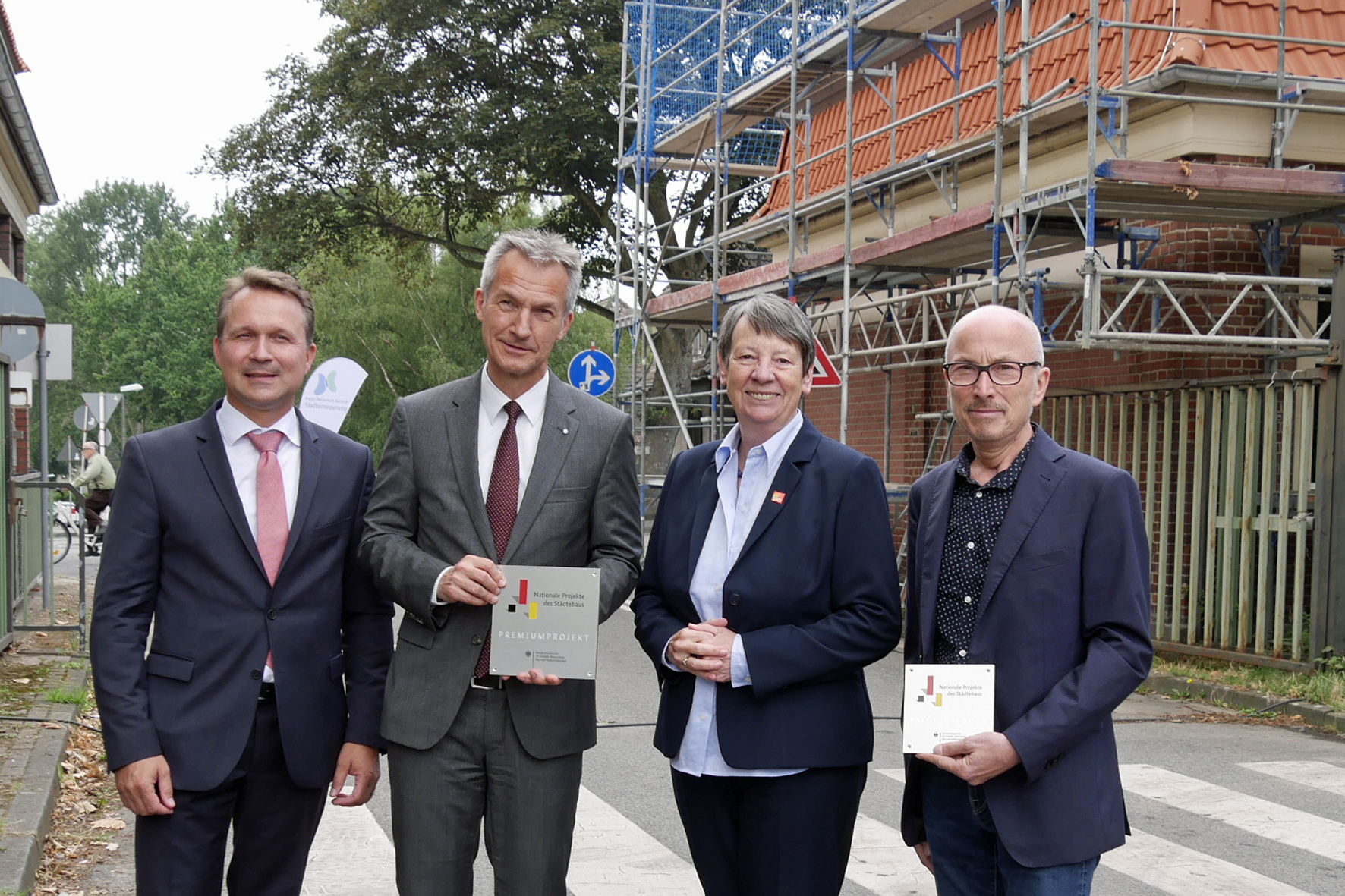 Ulrich Wessel, Geschäftsführer RAG Montan Immobilien GmbH und Betriebsdirektor RAG AG, Gelsenkirchens Oberbürgermeister Frank Baranowski, Bundesbauministerin Dr. Barbara Hendricks und Hertens Bürgermeister Fred Toplak (v.l.) vor den Torhäusern der ehemaligen Zeche Westerholt.