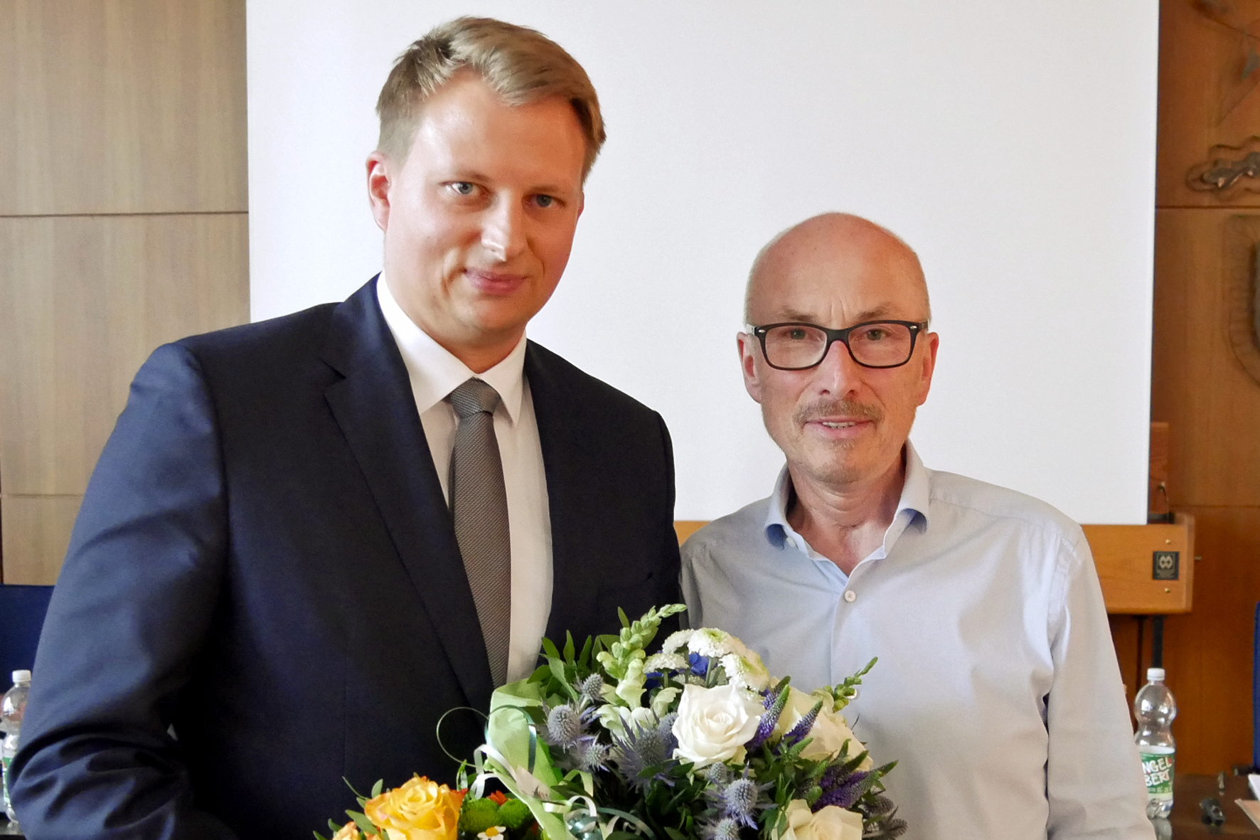 Christoph Heidenreich (rechts) ist neuer Stadtbaurat in Herten. Die Mitglieder des Hertener Stadtrats wählten ihn mehrheitlich. Bürgermeister Fred Toplak (rechts) gratuliert.