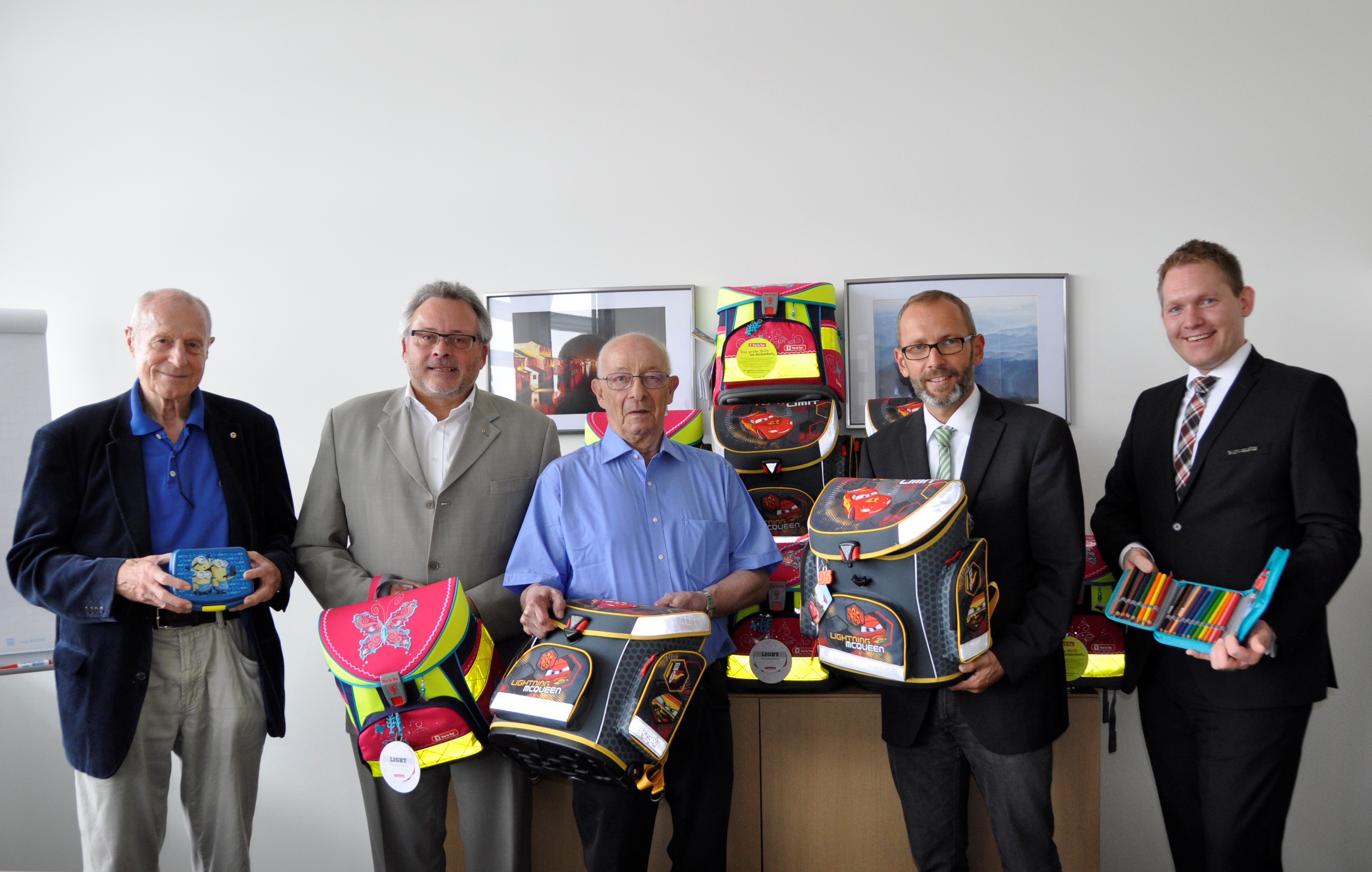 Dr. Adolf Staffe, Dr. Peter Timm-Arnold, Hubert Kober, Markus Märtens und Ralf Sturm (v.l.n.r.) präsentieren die Schulranzen und deren Inhalt.