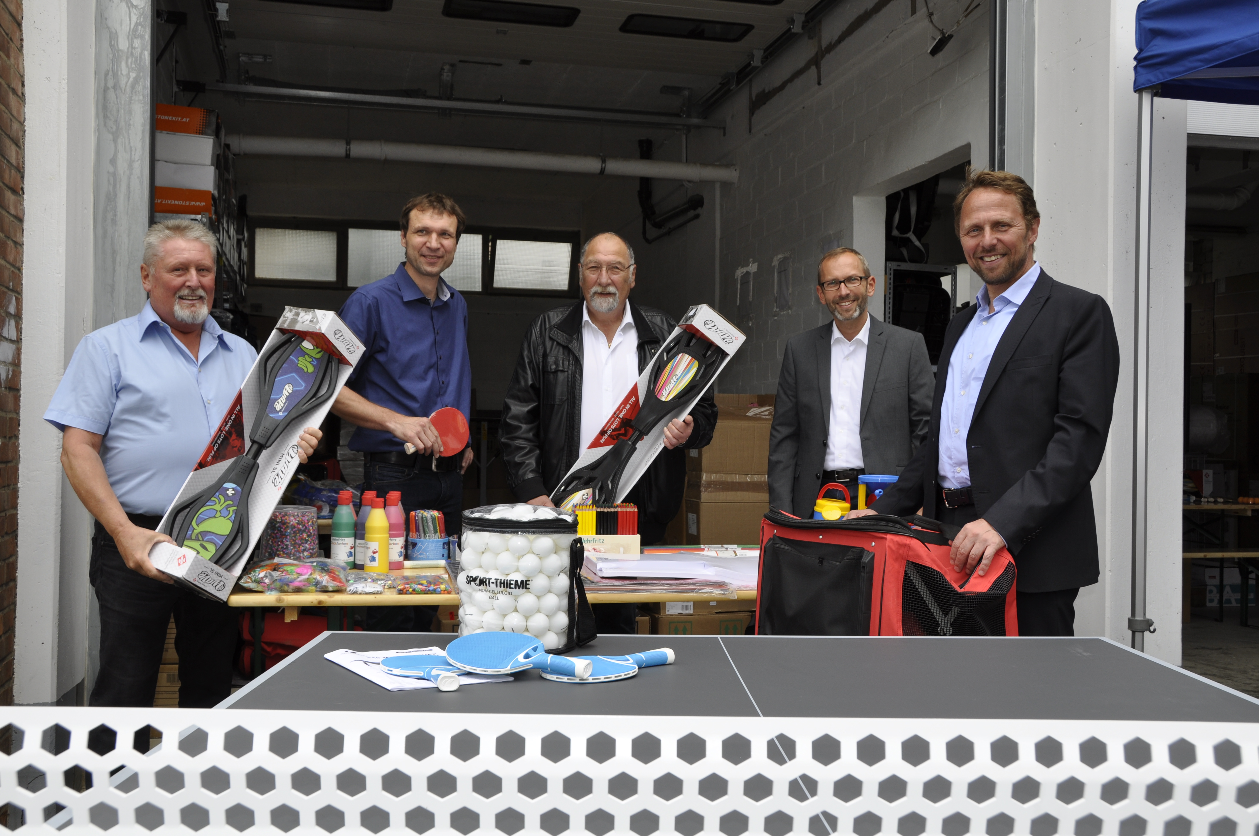 Manfred Kafier, Alexander Lünenbach, Dieter März, Markus Märtens und Oberbürgermeister Uwe Richrath (v.l.n.r.) präsentieren einen Teil der großen Auswahl an Spielutensilien.