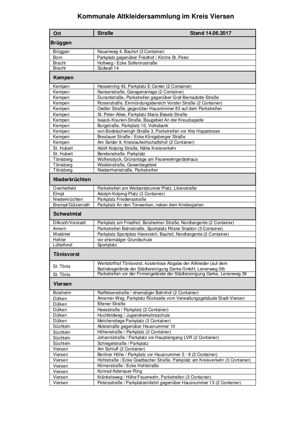 Die Standorte der Altkleidercontainer im Kreis Viersen als Liste