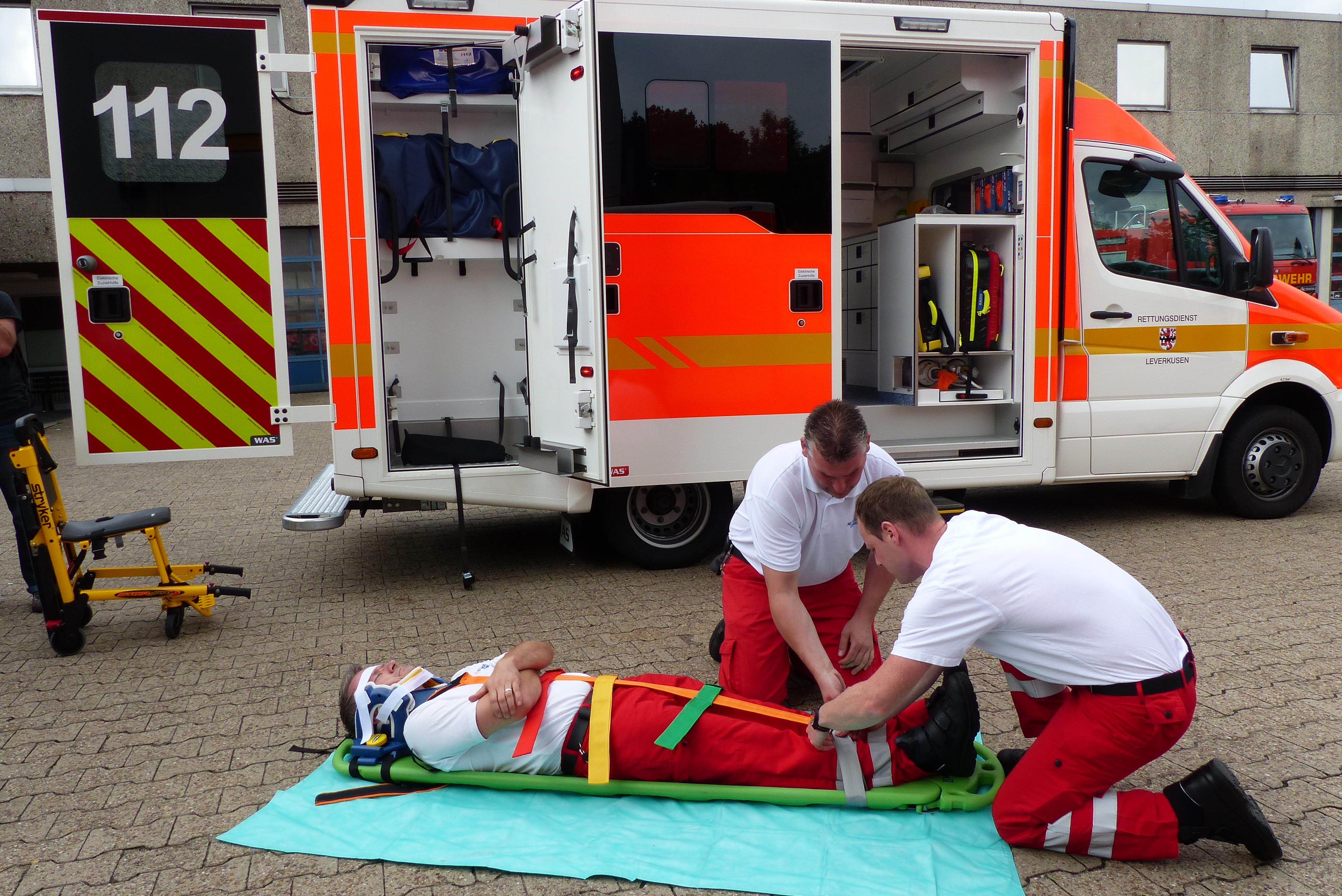 Oberbrandmeister Jan Fengler (li.), Oberbrandmeister Michael Fröhlen (re.) und Brandmeister Kai Eichmann (liegend)demonstrieren den Einsatz der Schaufeltragen-Spineboardkombination.