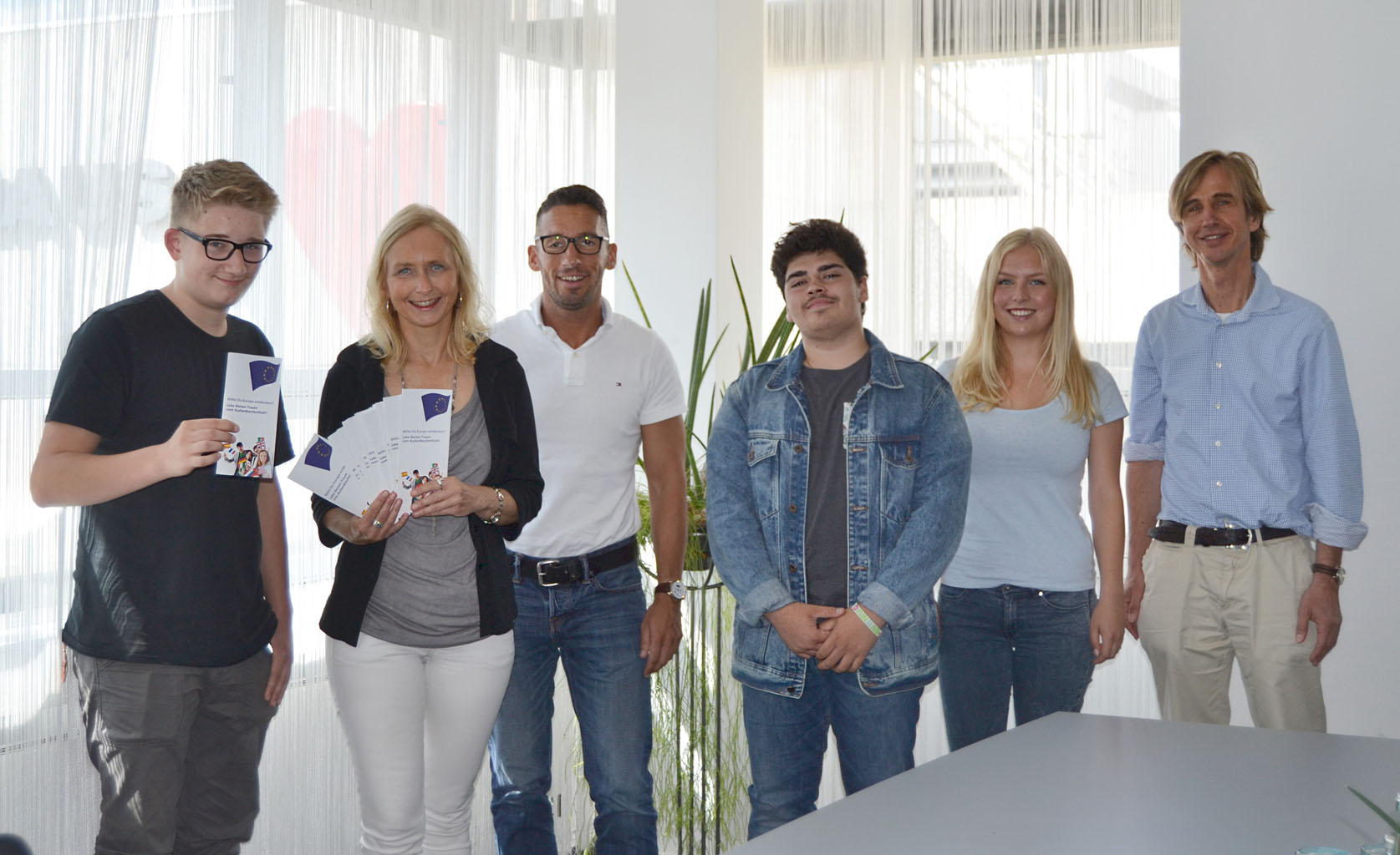 Werbung für den Europäischen Freiwilligendienst machten (v.r.). Projektkoordinator Dirk Schubert, die EFD-Absolventen Melanie Meisel und Philipp Rotthaus sowie Matthias Quaschnik und Katja Michalski vom Büro für Europaangelegenheiten mit „Azubi“ Moritz Vedder.