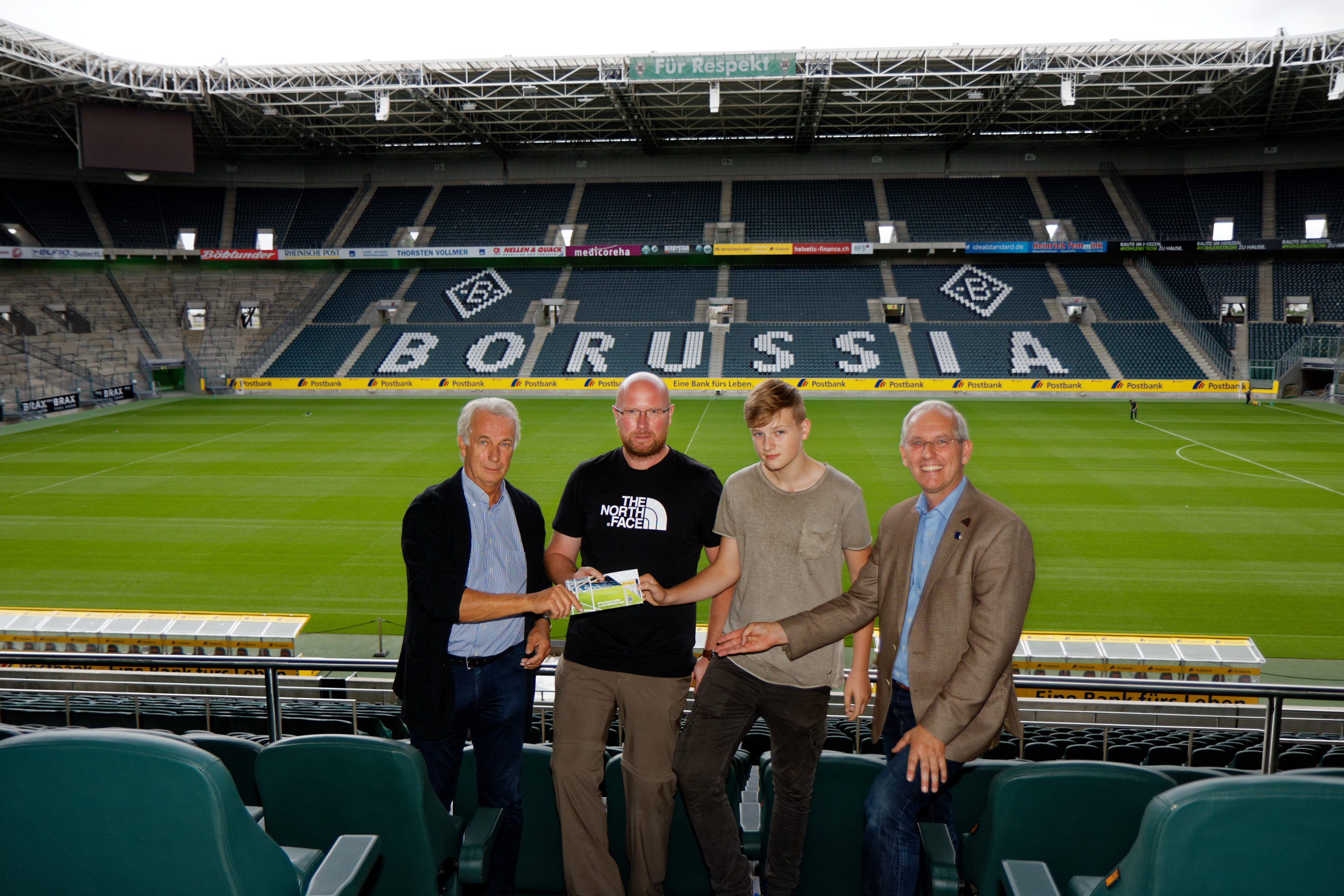 Rainer Bonhof (l.) und Naturpark-Geschäftsführer Michael Puschmann (r.) überreichen Dominik und Alexander Fater im Borussia-Park die Tickets für das Spiel gegen Eintracht Frankfurt am Samstag, 9. September.