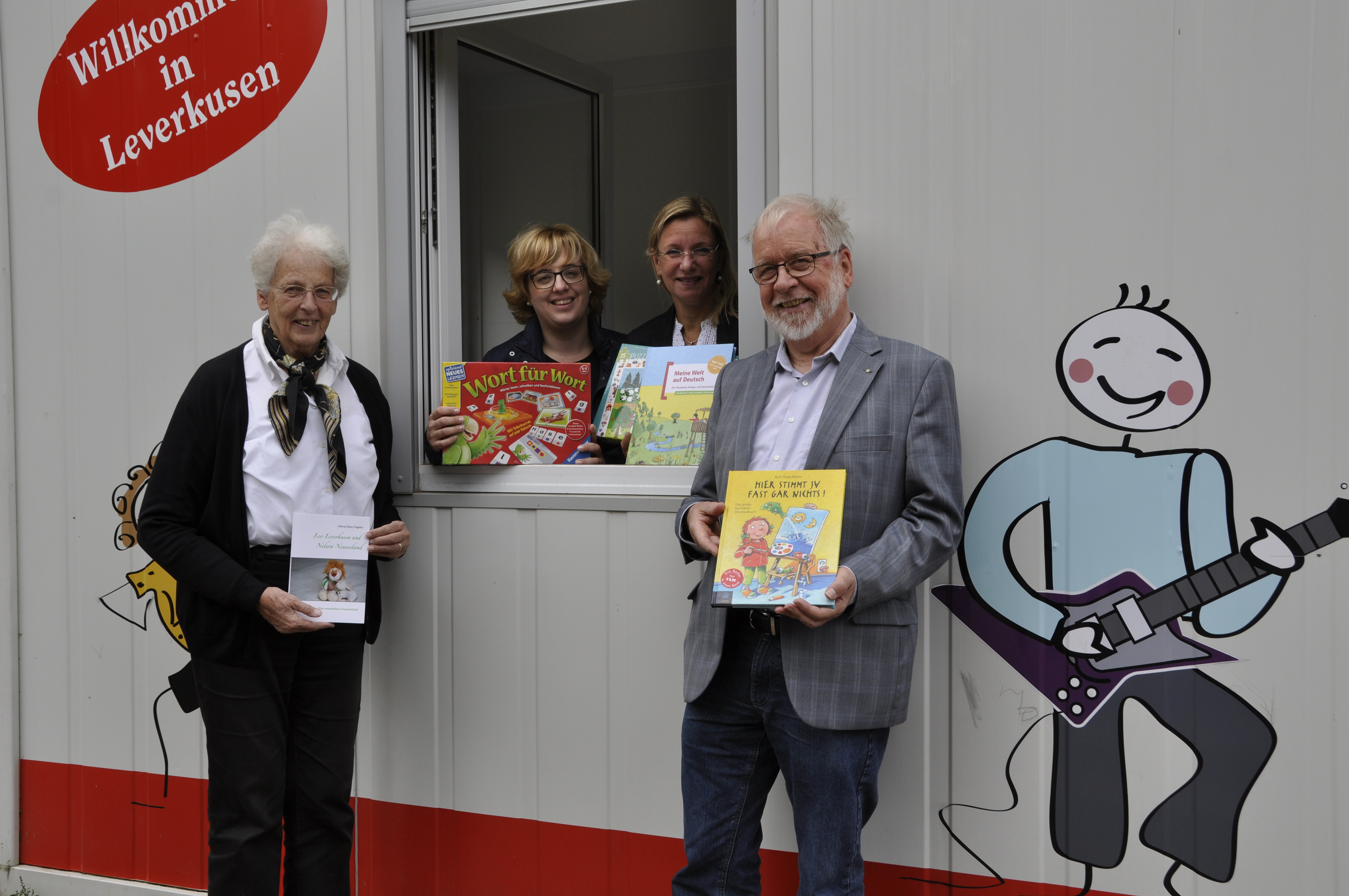 Freuen sich über das neue Spiel- und Lesematerial, das beim Deutsch-Lernen helfen soll (v.l.): Hiltrud Meier-Engelen, Präsidentin des Kiwanis Clubs Leverkusen, Katrin Arndt, Referentin des Beigeordneten für Bürger, Umwelt und Soziales, Ute Kommoß, Fachbereich Soziales (Sachgebietsleitung Unterbringung und Betreuung) und Klaus Grefges, Lieutenant Governor des Kiwanis Clubs Leverkusen, am Spielecontainer an der Unterkunft Heinrich-Claes-Straße.
