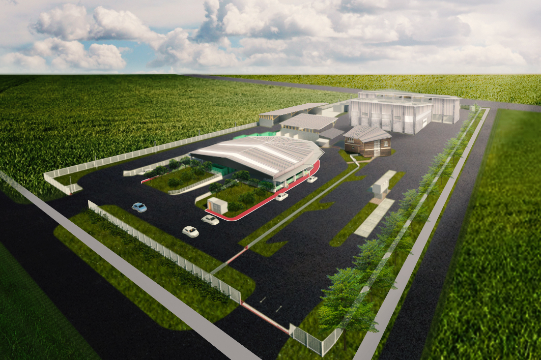 Lageplan des Wertstoff- und Logistikzentrums. Im Vordergrund ist das Wertstoffzentrum für die Bürger des Kreises erkennbar, im hinteren Bereich die Umladehallen des Logistikzentrums. Grafik: Kreis Viersen / Abdruck honorarfrei