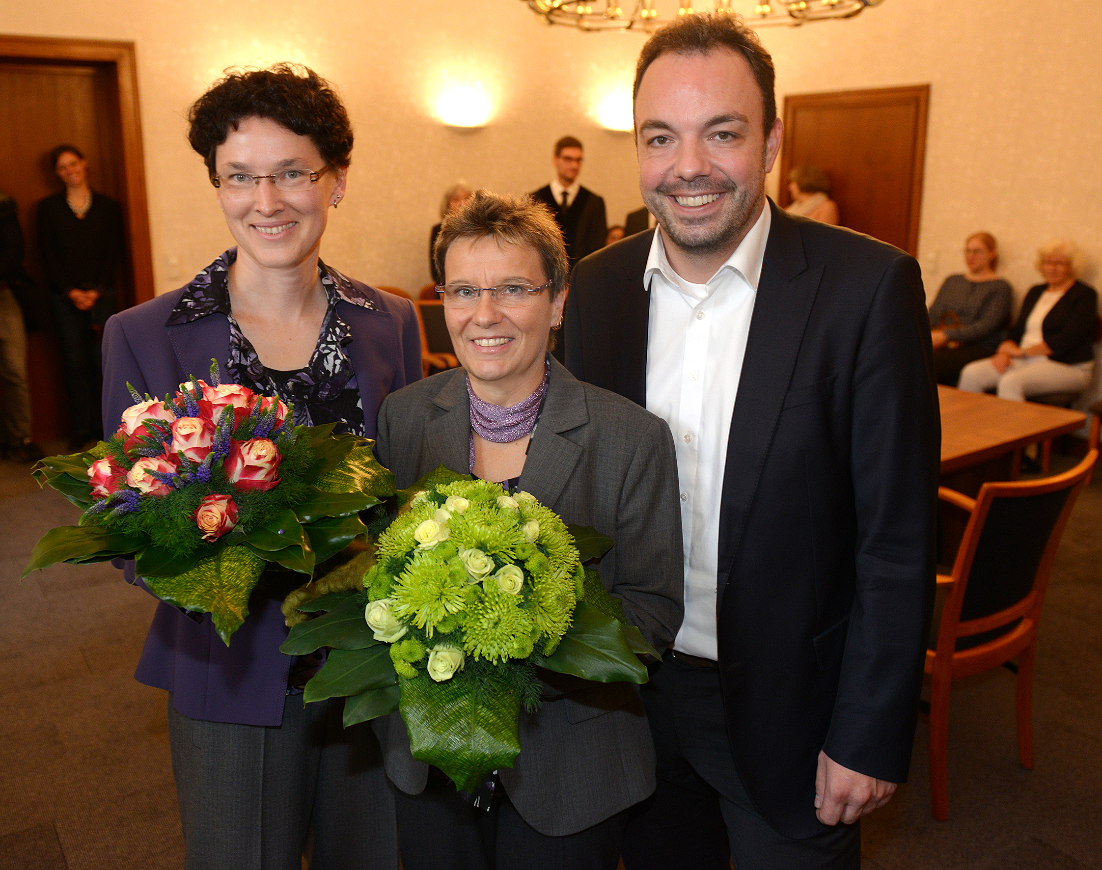 Sonja Kolb und Daniela Mücke haben heute in Kassel die erste gleichgeschlechtliche Ehe geschlossen. Oberbürgermeister Christian Geselle gratuliert dem Paar (Foto: Stadt Kassel; Harry Soremski)