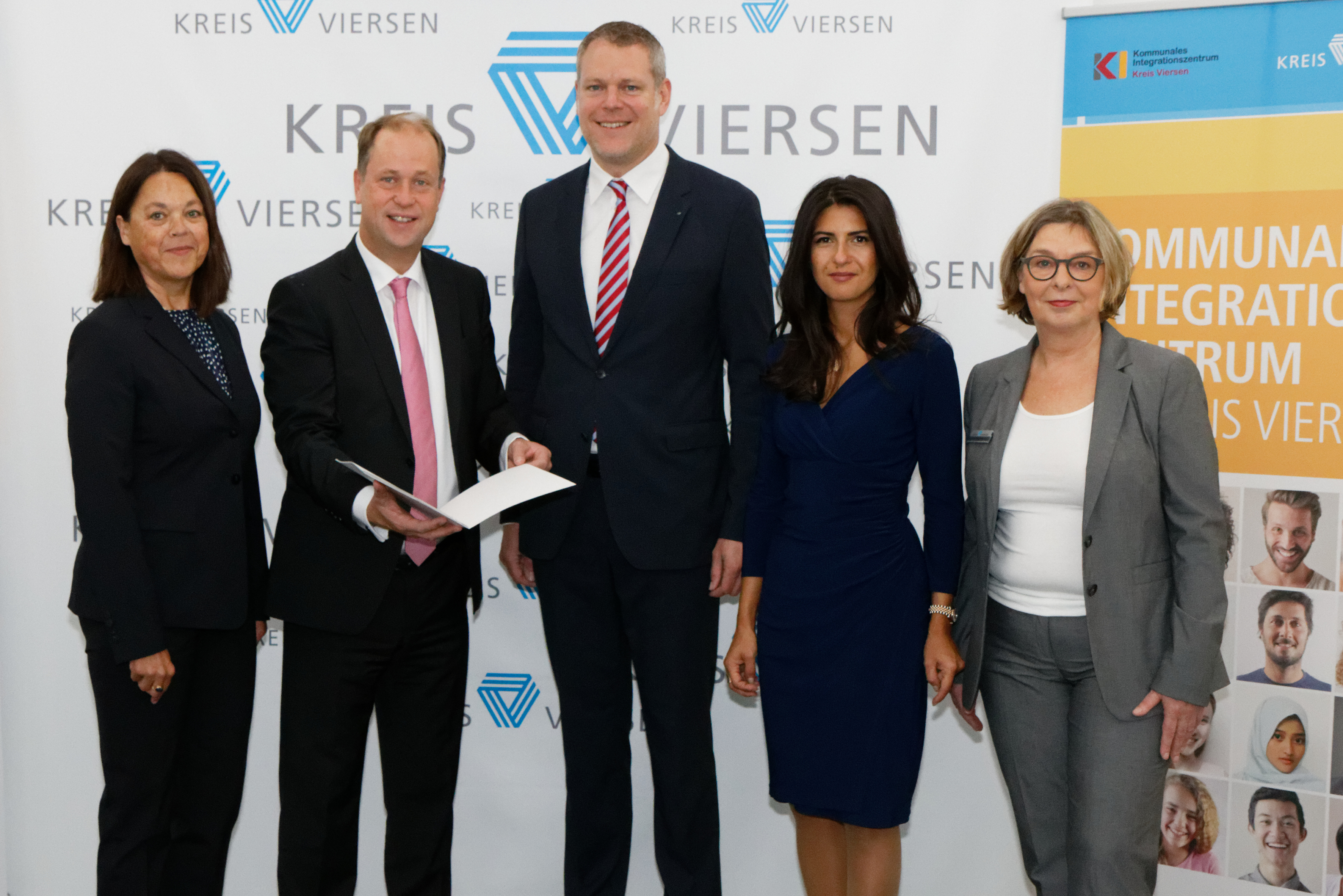 Übergabe des Förderbescheids für das Kommunale Integrationszentrum Kreis Viersen: Landrat Dr. Andreas Coenen (3.v.l.), Integrationsminister Joachim Stamp (2.v.l.), Sozialdezernentin Katarina Esser (l.), Integrationsstaatssekretärin Serap Güler und KI-Leiterin Mathilde Holtmanns (r.). Foto: Kreis Viersen / Abdruck honorarfrei