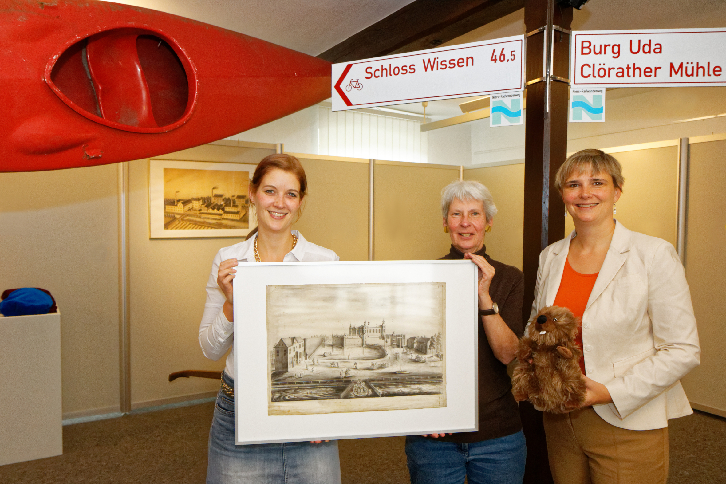 Anke Wielebski (v.l.), Leiterin des Niederrheinischen Freilichtmuseums, Dr. Barbara Grodde, Kuratorin der Ausstellung, sowie Margit Heinz, Pressereferentin des Niersverbands, mit unterschiedlichen Aspekten der neuen Sonderausstellung: Niersradweg und Kanu symbolisieren den hohen Freizeitwert des Flusses. Der Stich von Schloss Neersen zeigt die Bedeutung als Grenzfluss. Die Grefrather Textilindustrie im Hintergrund verwandelte den Fluss in eine Kloake. Foto: Kreis Viersen / Abdruck honorarfrei