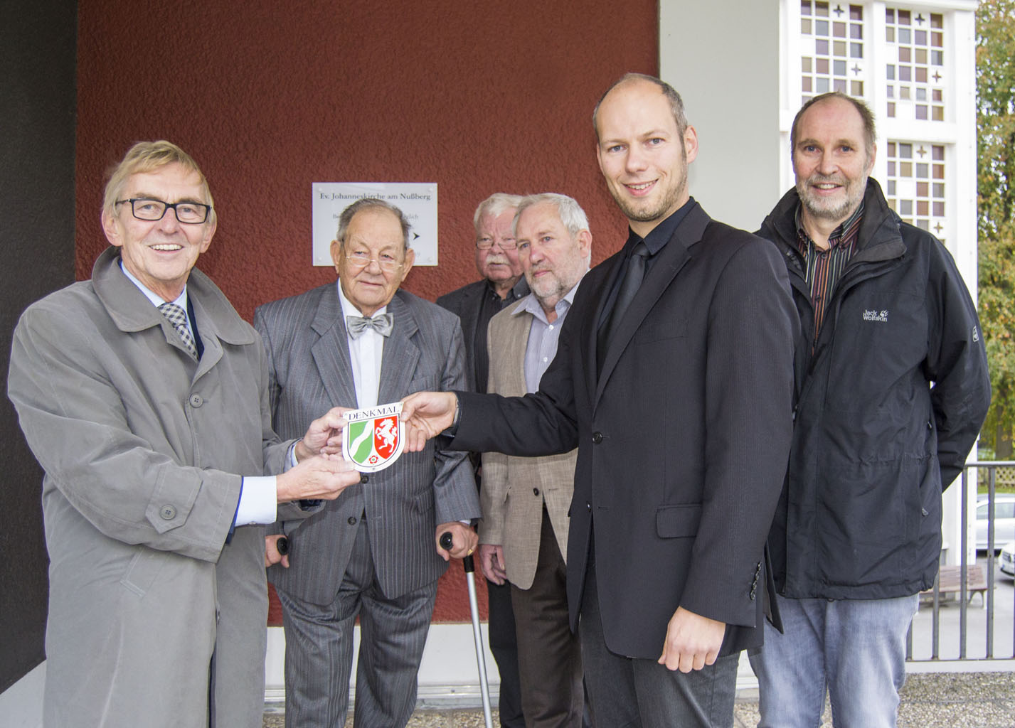 Bei einem Pressetermin überreichte Bürgermeister Dr. Peter Paul Ahrens im Beisein des Architekten Ernst Dossmann (2.v.l.), Vertretern des Presbyteriums sowie Michael Knaacks von der Unteren Denkmalbehörde bei der Stadt Iserlohn die Denkmalplakette des Landes NRW an Pfarrer Tom Mindemann.