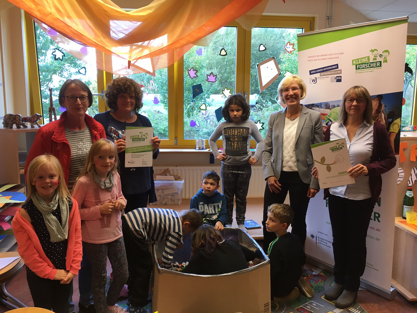 Große Freude herrschte in der vergangenen Woche bei den Kindern und Erwachsenen in der OGS Auf der Emst, als das Zertifikat „Haus der kleinen Forscher“ übergeben wurde (v.l.): Susanne Hillemann (HdkF-Workshop-Trainerin), Christa Fobbe (OGS Emst), Jutta Groß (Geschäftsführerin des KJU als regionaler HdkF-Ansprechpartner) und Cornelia Domininghaus (OGS Emst).