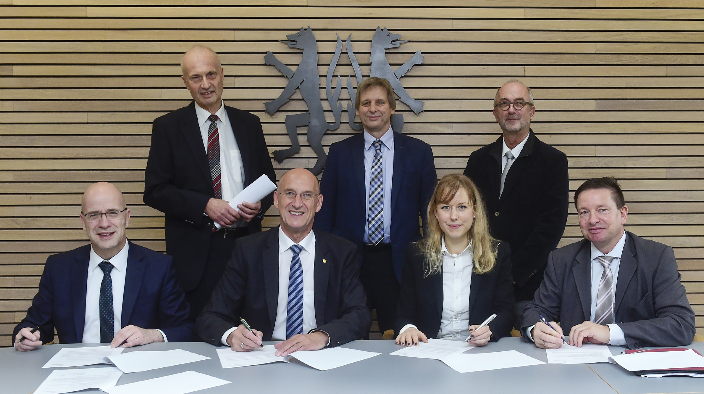 Vordere Reihe v.l.n.r.: Stefan Honrath (Leiter der BraWo-Direktion Peine), Landrat Franz Einhaus, Alexandra Fuchs (Geschäftsführerin Operativ der Agentur für Arbeit Hildesheim), Oliver Syring (Geschäftsführer der Allianz für die Region) Hintere Reihe v.l.n.r.: Kreisrat für Soziales Dr. Detlef Buhmann, Bernd Manthey (Leiter Bildung Allianz für die Region GmbH) und Rainer Weste (Teamleiter Berufsberatung bei der Agentur für Arbeit Hildesheim)
