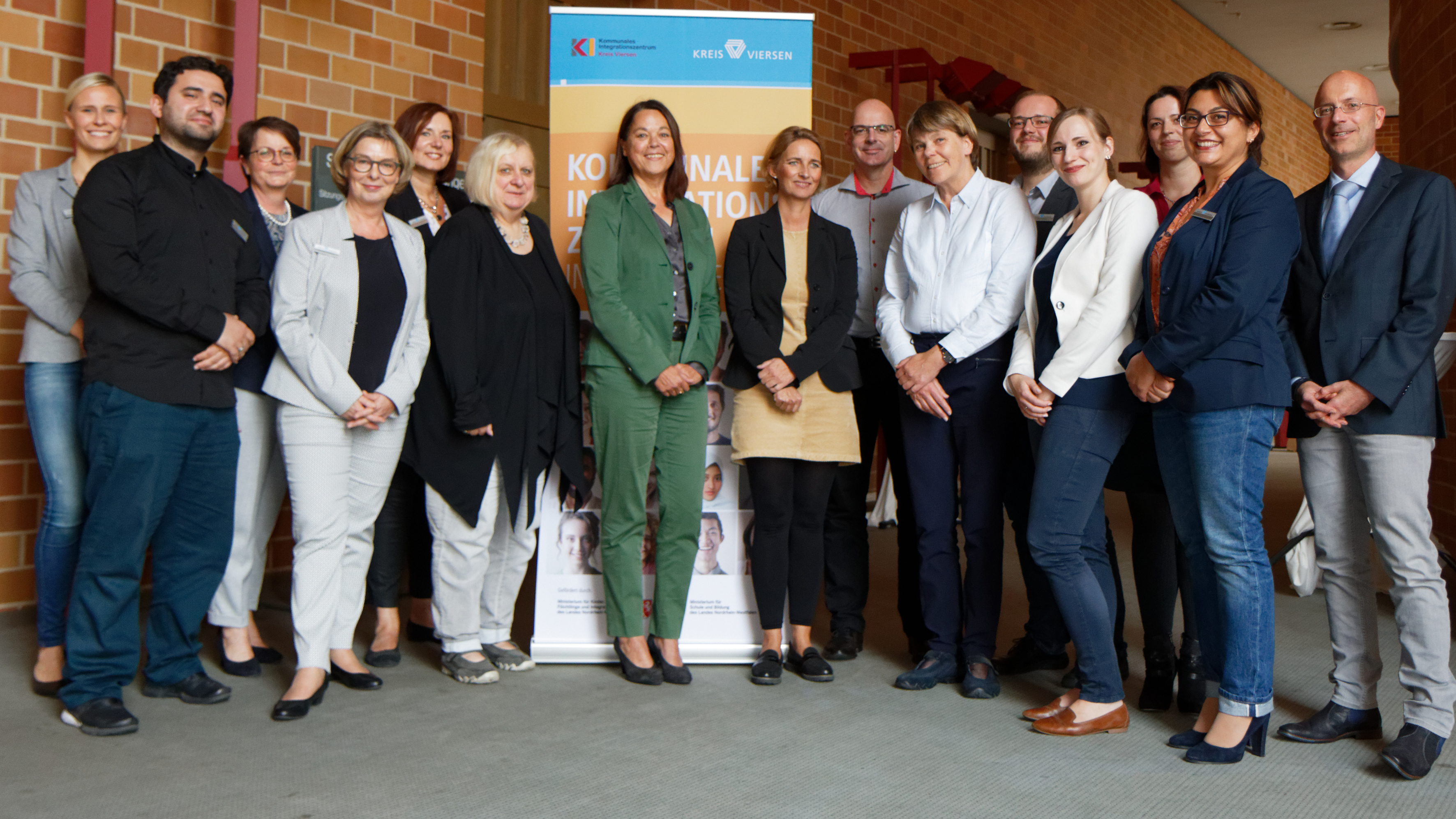 Freuen sich über den guten Start des Kommunalen Integrationszentrums (KI) im Kreis Viersen: Sozialdezernentin Katarina Esser (6.v.l.), Christiane Schüßler (7.v.l.; Ministerium für Schule und Bildung NRW), Agnes Heuvelmann (9.v.l.; Ministerium für Kinder, Familie, Flüchtlinge und Integration), Mathilde Holtmanns (3.v.l.; Leiterin KI Kreis Viersen) und Christiane Bainski (5.v.l.; Landeskoordinierungsstelle der Kommunalen Integrationszentren). Foto: Kreis Viersen / Abdruck honorarfrei