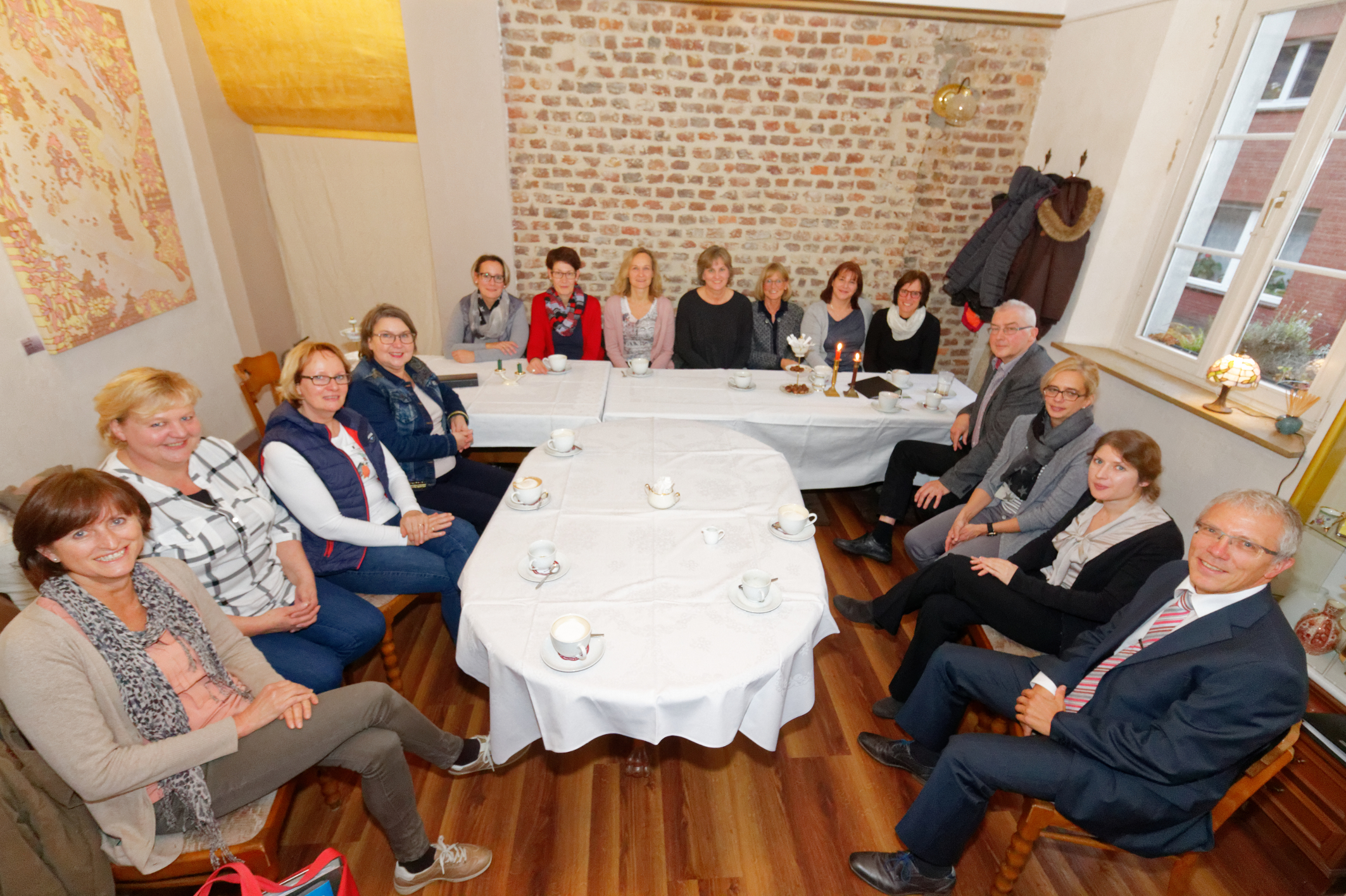 Die Initiatoren des Erziehungsführerschein beim Gedankenaustausch mit den Erzieherinnen: Kreisjugendamtsleiter Lothar Thorissen, Abteilungsleiterin Dr. Sarah Werth (vorne v.r.), Mitarbeiterin Susanne Reinartz (2.v.l.) sowie Annegret Klein-Heßling (hinen 3.v.l.), Leiterin der Evangelischen Beratungsstelle, und ihr ehemaliger Kollege Jürgen Steckel (4. v.r.). Foto: Kreis Viersen / Abdruck honorarfrei