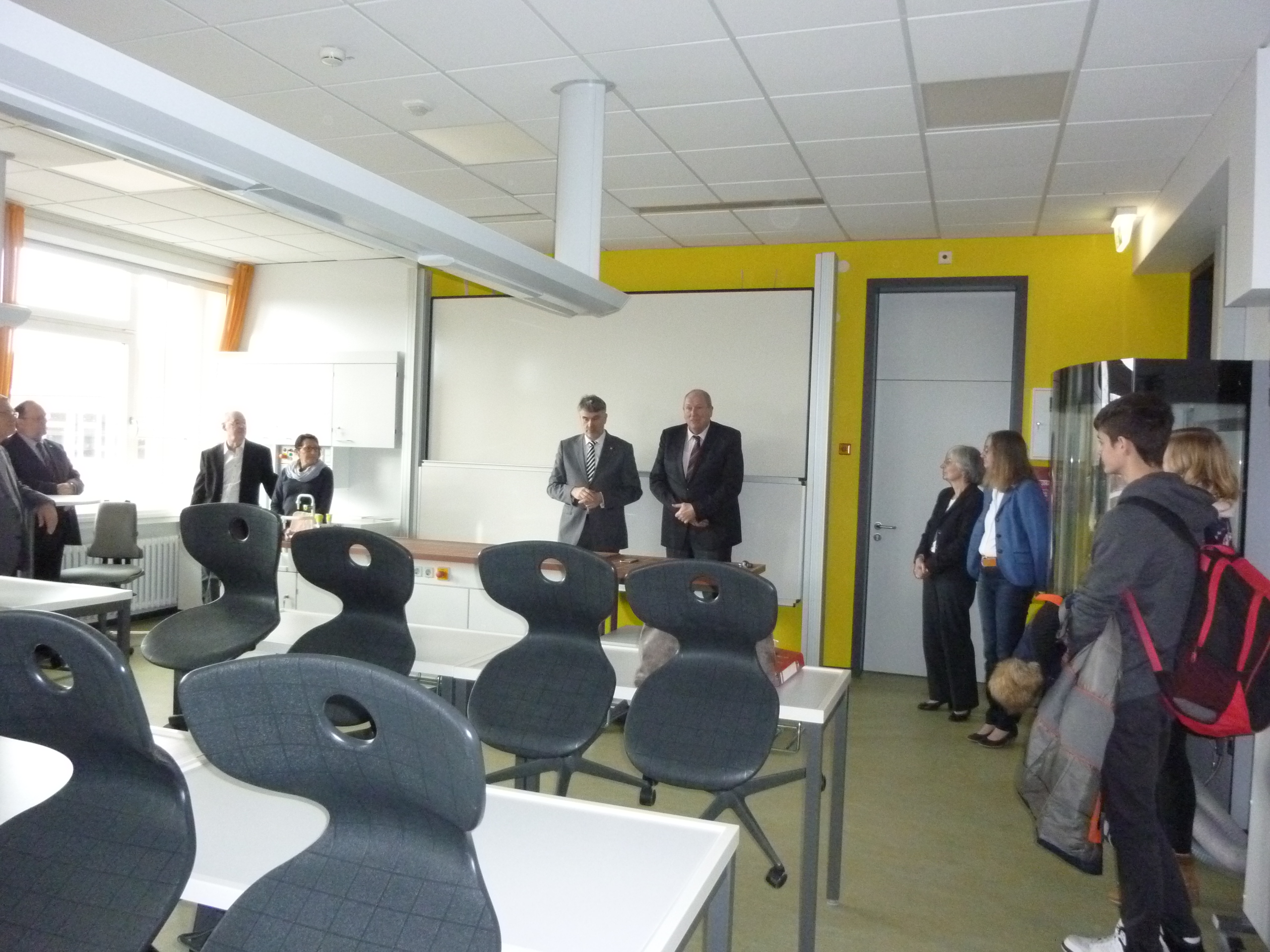 Erster Kreisrat Henning Heiß (Bildmitte links) bei der Übergabe des Fachunterrichtsraumes im Beisein des Bürgermeisters der Gemeinde Ilsede Otto-Heinz Fründt (Bildmitte rechts)