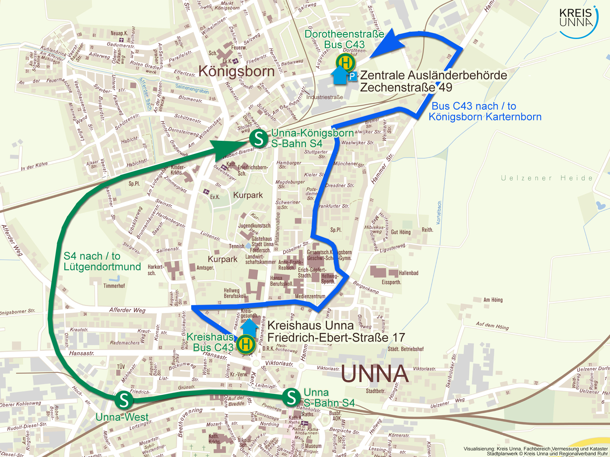 Die Karte dient der Orientierung, wie die kommunale Ausländerbehörde ab dem 17. Januar mit öffentlichen Verkehrsmitteln am besten erreicht werden kann. Visualisierung: Sebastian Hellmann - Kreis Unna, FB Vermessung und Kataster