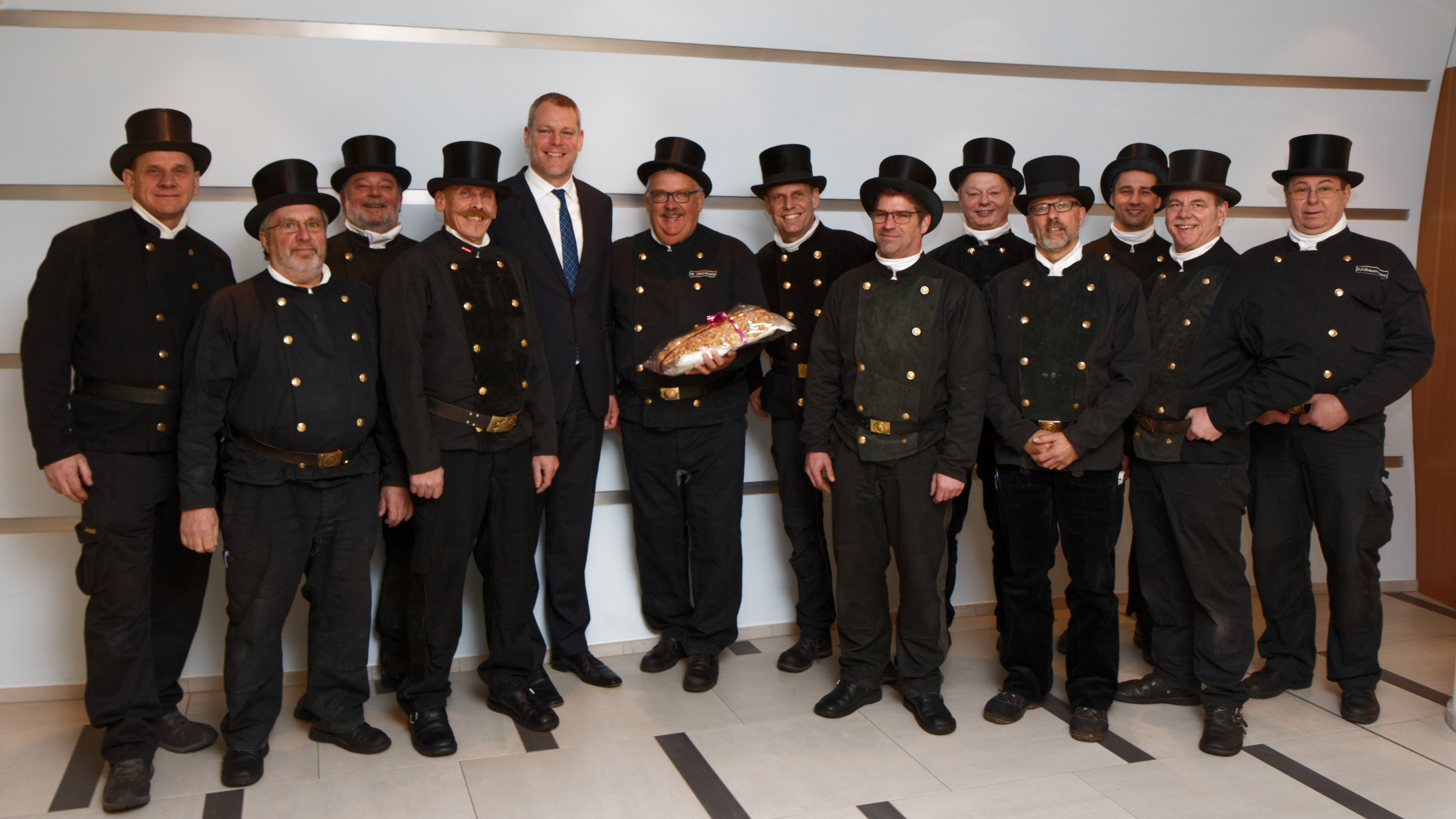 Glücksbringer im Kreishaus: Landrat Dr. Andreas Coenen (5.v.l.) begrüßt Kreisschornsteinfeger-Obmann Bernd Gormanns (4.v.l.) mit seinen Kollegen. Foto: Kreis Viersen / Abdruck honorarfrei