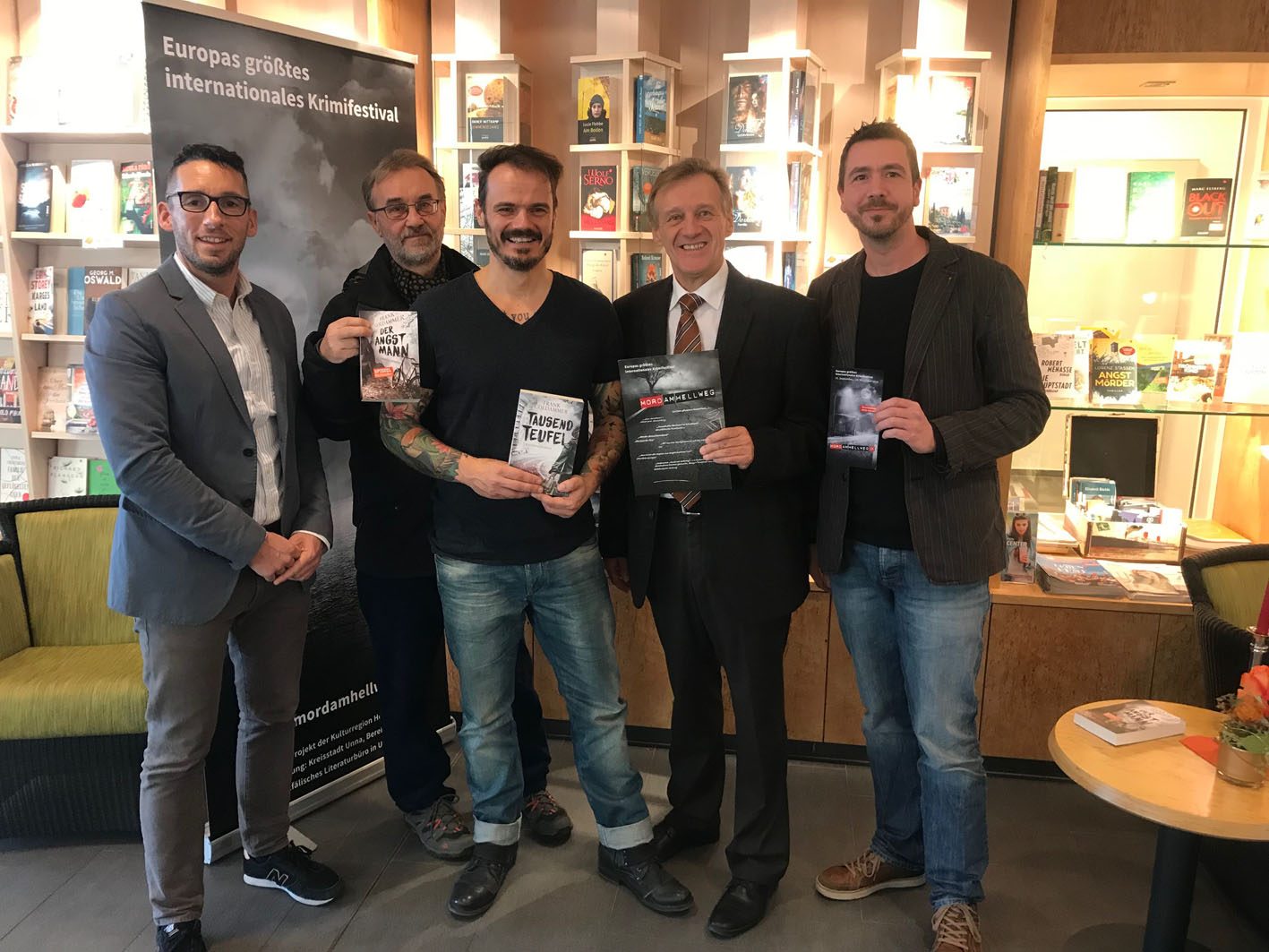 Frank Goldammer (M.) macht im Rahmen des Krimifestivals „Mord am Hellweg“ Iserlohn zum „Tatort“. Bei einem ersten Besuch in der Waldstadt wurde er begrüßt und vorgestellt von Matthias Quaschnik (städtisches Kulturreferat), Autor und Kulturausschussmitglied Dr. Walther Wehner, Kulturressortleiter Jochen Köhnke und Heiner Remmert vom Westfälischen Literaturbüro (v.l.).