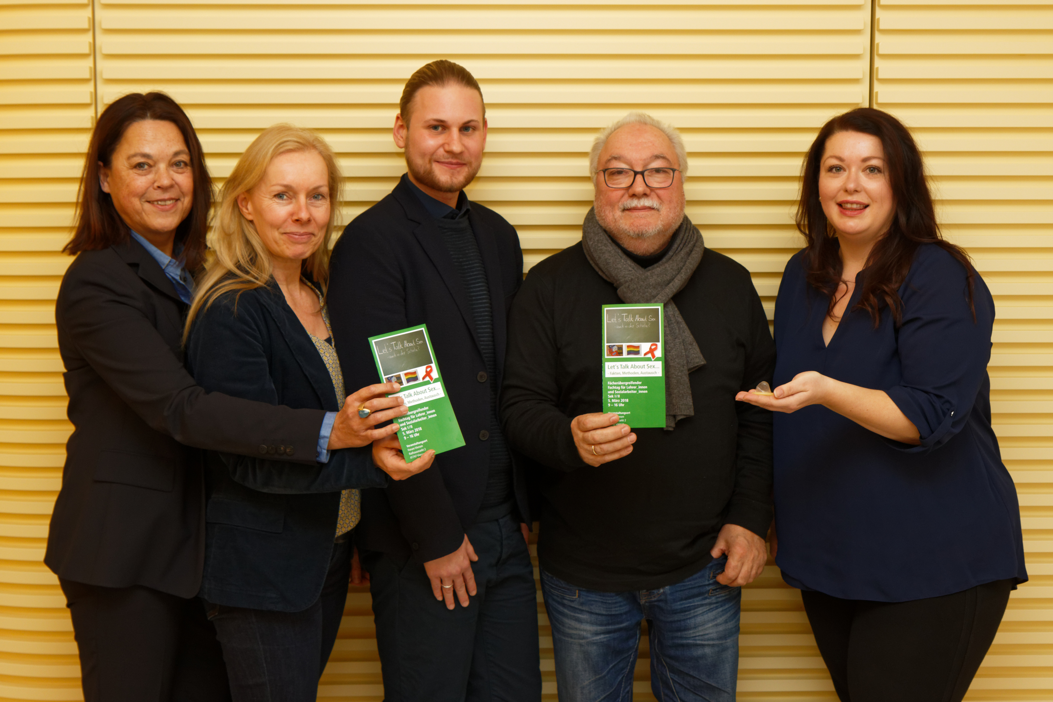 Freuen sich auf die Workshops mit Lehrerinnen und Lehrern aus dem Kreis Viersen, Mönchengladbach und Krefeld: (v.l.) Katarina Esser (Dezernentin Soziales, Gesundheit und Arbeit des Kreises Viersen), Beate Guse (Gesundheitsamt des Kreises Viersen), Alexander Marschner (AIDS-Hilfe Mönchengladbach/Rheydt e.V.), Klaus Neufeldt (GEW-Kreisverband Viersen), Anja Wiese (AIDS-Hilfe Krefeld e.V.). Foto: Kreis Viersen / Abdruck honorarfrei
